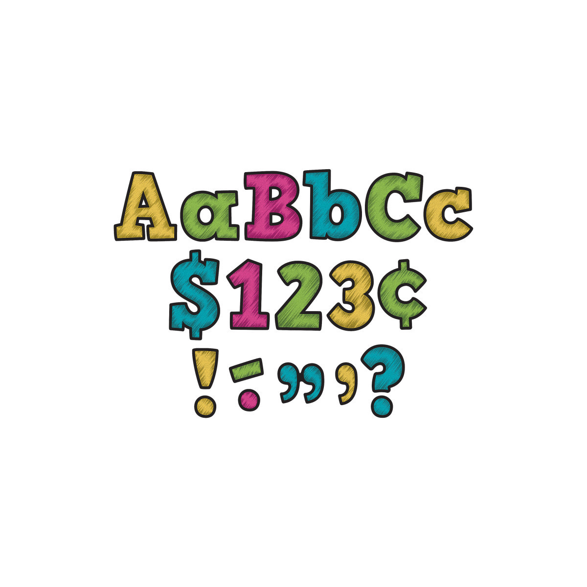Use these letters to create bulletin boards, classroom centers, signs, banners, and other displays. They punch out easily and are coated for durability. The colors and designs coordinate with popular decorative products from Teacher Created Resources. Each pack includes 230 total pieces: 61 uppercase letters, 95 lowercase letters, 20 numbers 0 to 9, 40 punctuation marks, 14 Spanish accent marks.