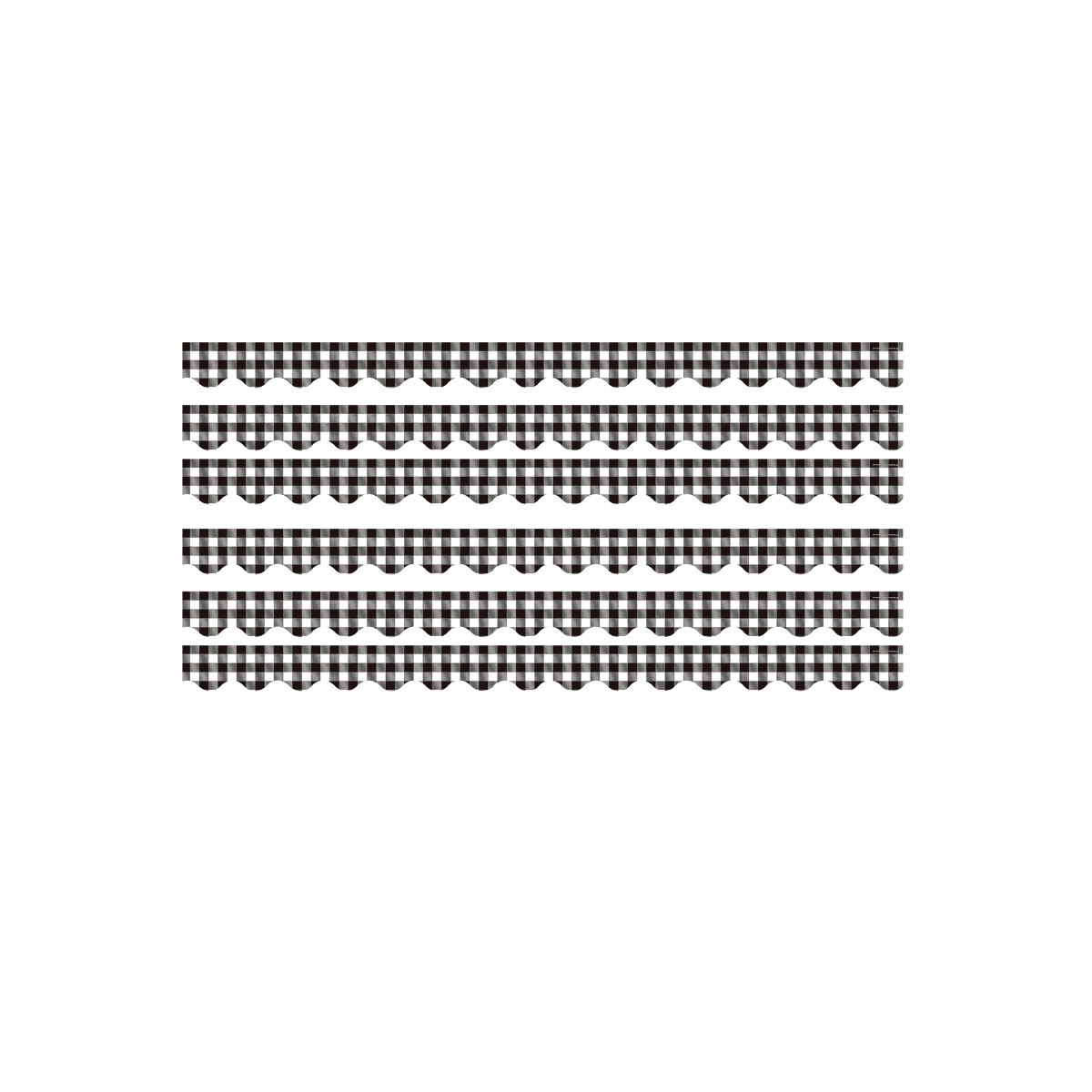 Use Black and White Gingham Scalloped border trim to liven up your classroom! Create fresh looks for bulletin boards, windows, walls, and class projects. Mix and match with coordinating products (stickers, notepads, awards, etc.) for a classroom theme. Each pack has 12 pieces (2-3/16" x 35") for a total length of 35 feet of trim! Sold as 6 packs for a total of 72 pieces (210 feet).