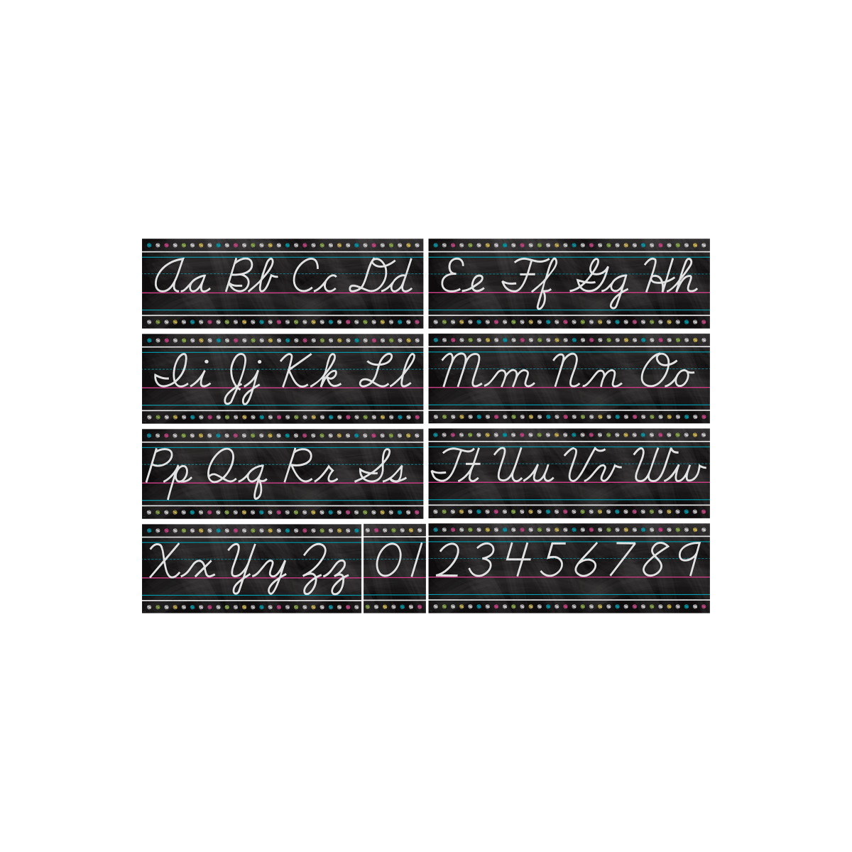 Display the alphabet and numbers 0—9 as a handy reference for young students. The 4-page teacher's guide includes writing tips. Includes 9 panels for over a 17-foot long alphabet line. Each 4-letter panel is 23-1/2" x 7-1/2".