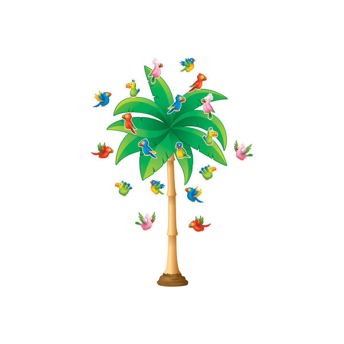 This colorful bulletin board will fit perfectly in your classroom. The pieces can be used to make one 80" palm tree or two 57" palm trees. Assembly instructions and a teacher's guide are included. 71 total pieces including 8 tree trunks, 18 palm leaves, and 45 tropical birds.
