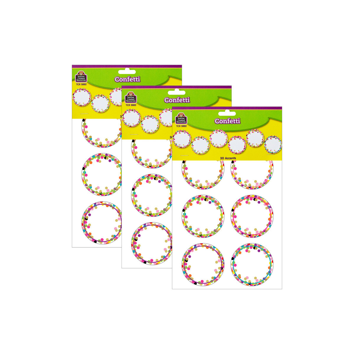 Use this decorative artwork to dress up classroom walls and doors, label bins and desks, or accent bulletin boards. Each accent measures approximately 6". Each pack contains 30 accents in 6 colors. Sold as 3 packs for a total of 90 accents.