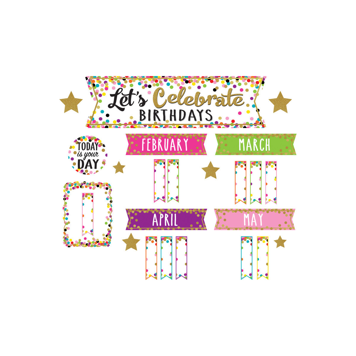 This festive mini bulletin board will bring an air of cheery celebration to students' birthdays. The "Let's Celebrate Birthdays" header piece measures 21" x 6". Includes a "Today is your Day" frame and 39 labels for student names. 60 total pieces.