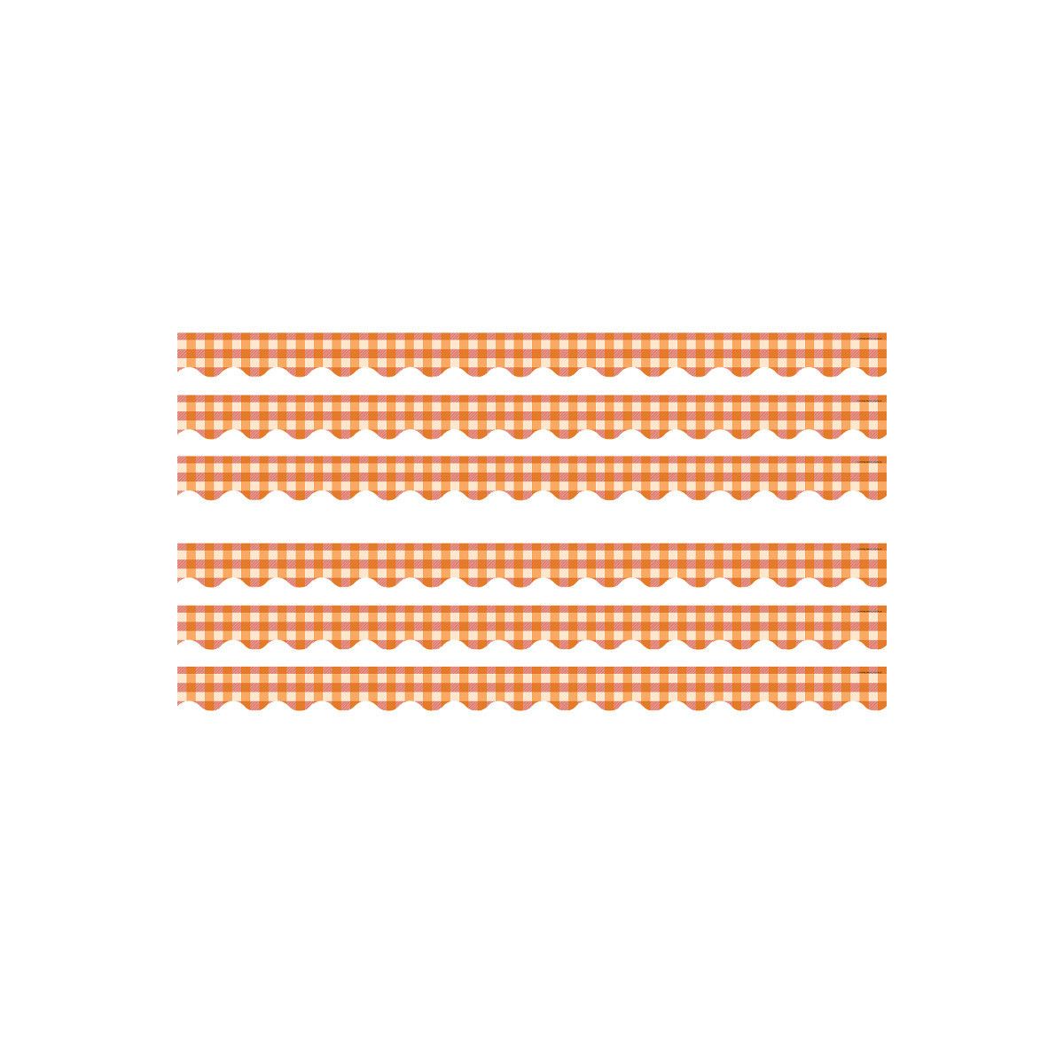 Use this Orange Gingham Scalloped border trim to liven up your classroom! Create fresh looks for bulletin boards, windows, walls, and class projects. Mix and match with coordinating products (stickers, notepads, awards, etc.) for a classroom theme. Each pack has 12 pieces (2-3/16" x 35") for a total length of 35 feet of trim! Sold as 6 packs for a total of 72 pieces (210 feet).