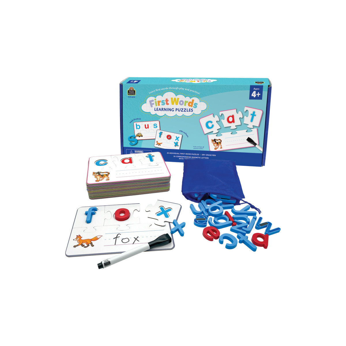 - Complete Set: Each set contains 20 four-piece write-on/wipe-off puzzles, a dry-erase pen, 26 magnetic letters, and a fabric storage bag.