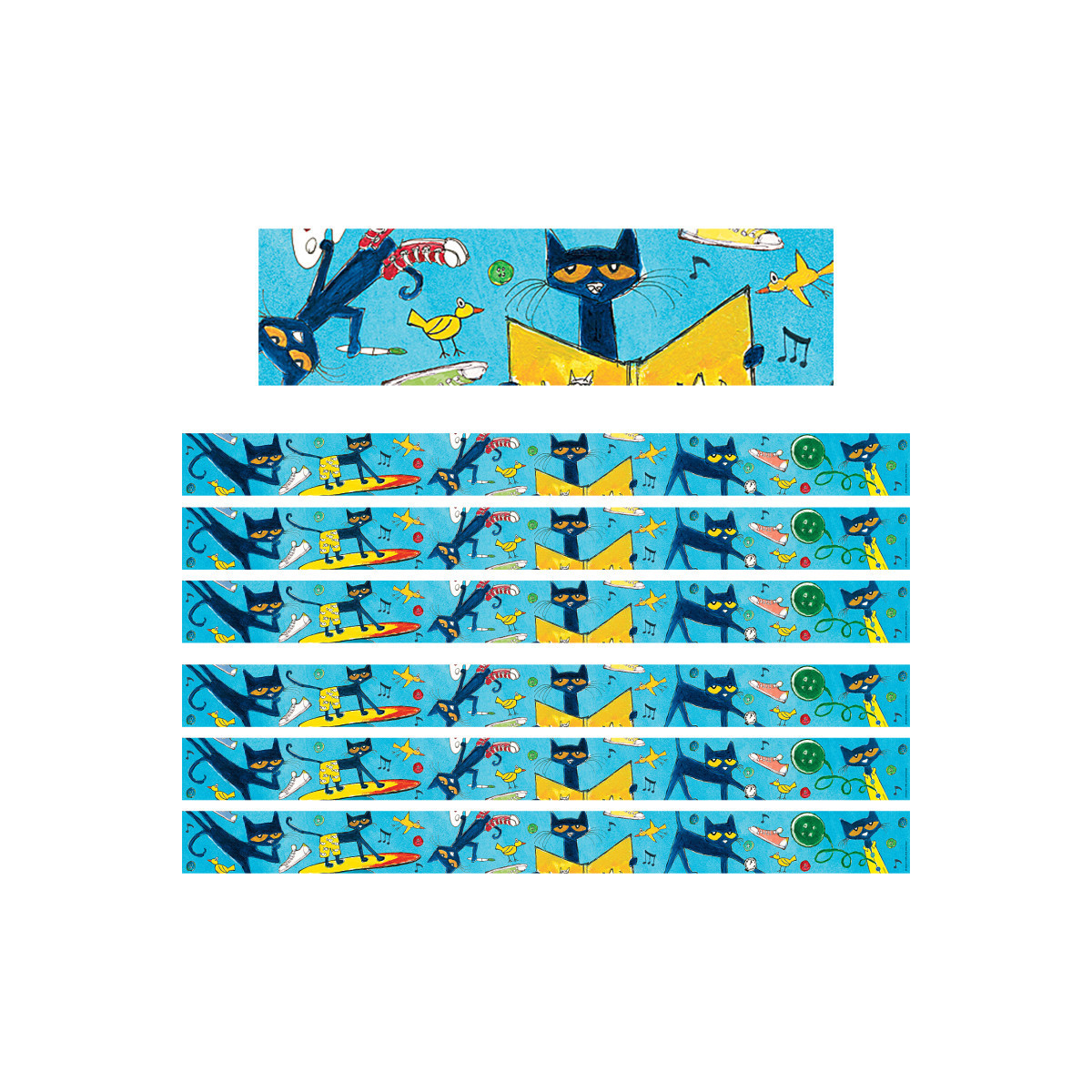 Use colorful border trim to liven up your classroom! Create fresh looks for bulletin boards, windows, walls, and class projects. Mix and match with coordinating products (stickers, notepads, awards, etc.) for a classroom theme. Each piece is 35" x 3". Color coordinate with other classroom styles. Each pack includes 12 pieces for a total of 35 feet. Sold as 6 packs for a total of 72 strips (210 feet).