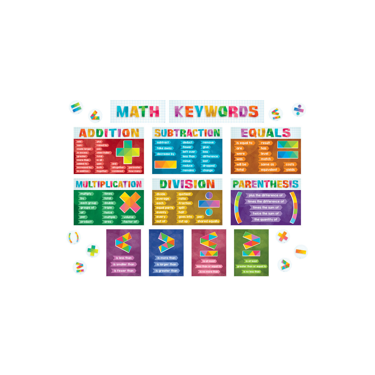 Unlock the language of math for your students with this comprehensive bulletin board set! Featuring keywords for addition, subtraction, multiplication, and division, this visual reference will help students tackle word problems with ease and enhance their problem-solving skills. The colorful and clear design of this bulletin board will create a stimulating learning environment in any classroom, fostering confidence and understanding in math vocabulary. With 22 total pieces including 2 "Math Keywords" title pieces, 10 posters, 10 math symbol accents, and a bulletin board guide with set-up and activity suggestions, this set is a must-have for any math teacher. The largest piece measures 23-1/4" x 5-1/2" and includes a protective coating for durability. Elevate your math instruction with this engaging and educational bulletin board set!