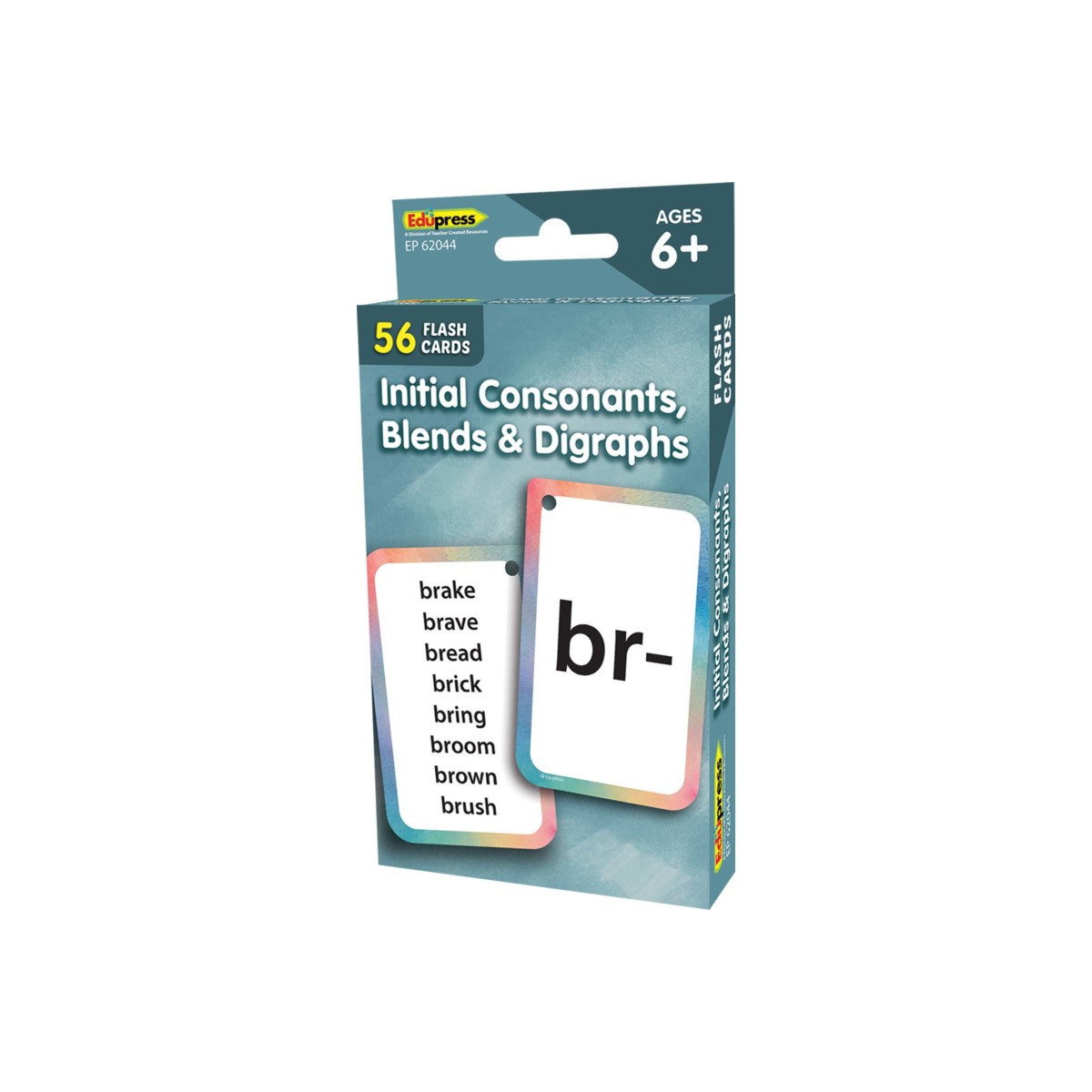 Teach and review initial consonants, blends, and digraphs individually, in groups, or with the whole class! Each flash card set contains a collection of full-color, high-interest student cards as well as instructions and tips for the teacher or parent, suggested activities, and additional blank cards. Each card has a hole in the top corner that can be fit with a ring or string to help with organization and storage. Additionally, each card has one corner that is shaped differently than the others. By lining up the non-rounded corners, the flash cards can quickly be faced in the same direction. When applicable, flash card sets include answers in small print on the reverse side of each card. Each card measures 3-1/8" x 5-1/8". Each set includes 56 double-sided cards.