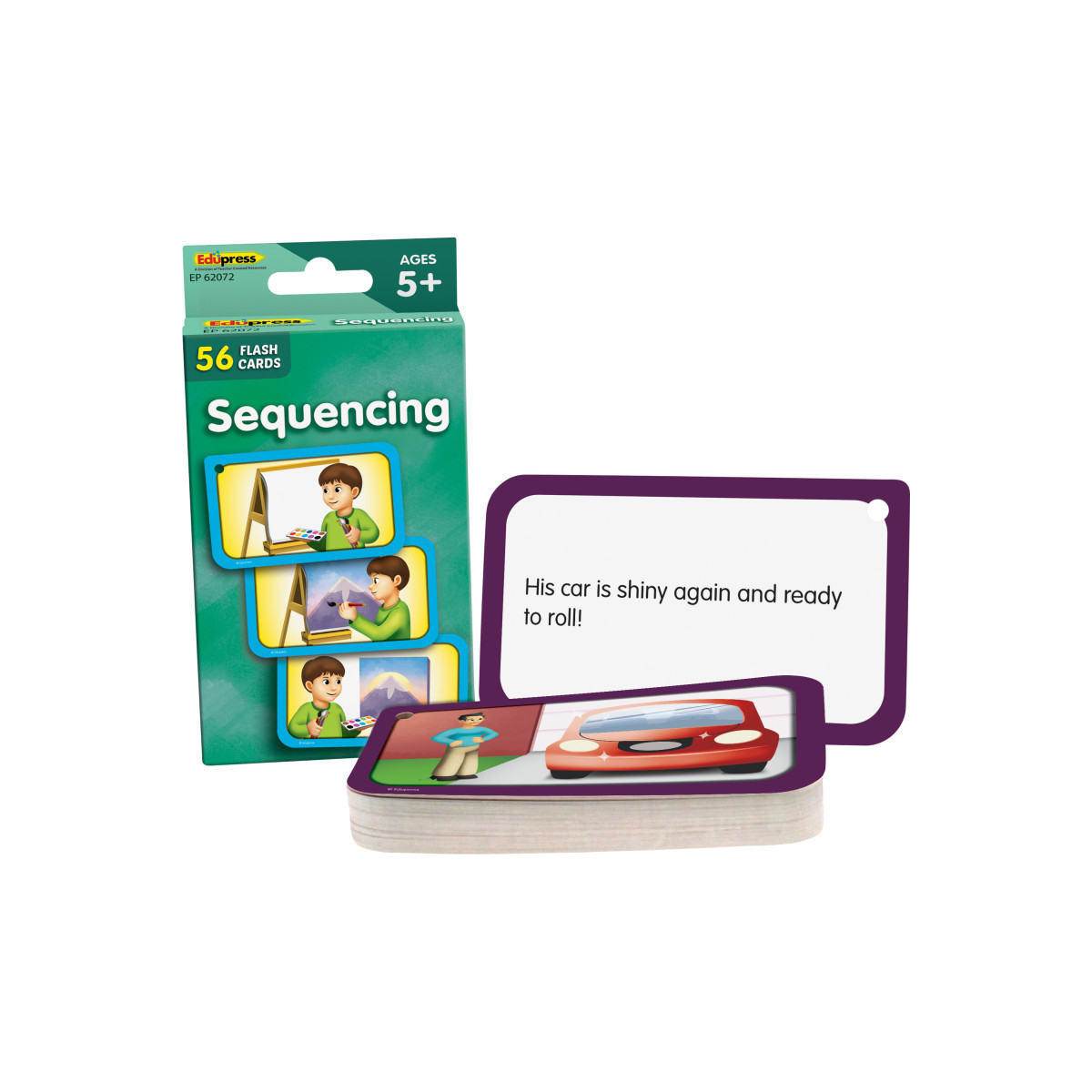 Each flash card set contains a collection of full-color, high-interest student cards as well as instructions and tips for the teacher or parent, suggested activities, and additional blank cards. Each card has a hole in the top corner that can be fit with a ring or string to help with organization and storage. Additionally, each card has one corner that is shaped differently than the others. By lining up the non-rounded corners, the flash cards can quickly be faced in the same direction.