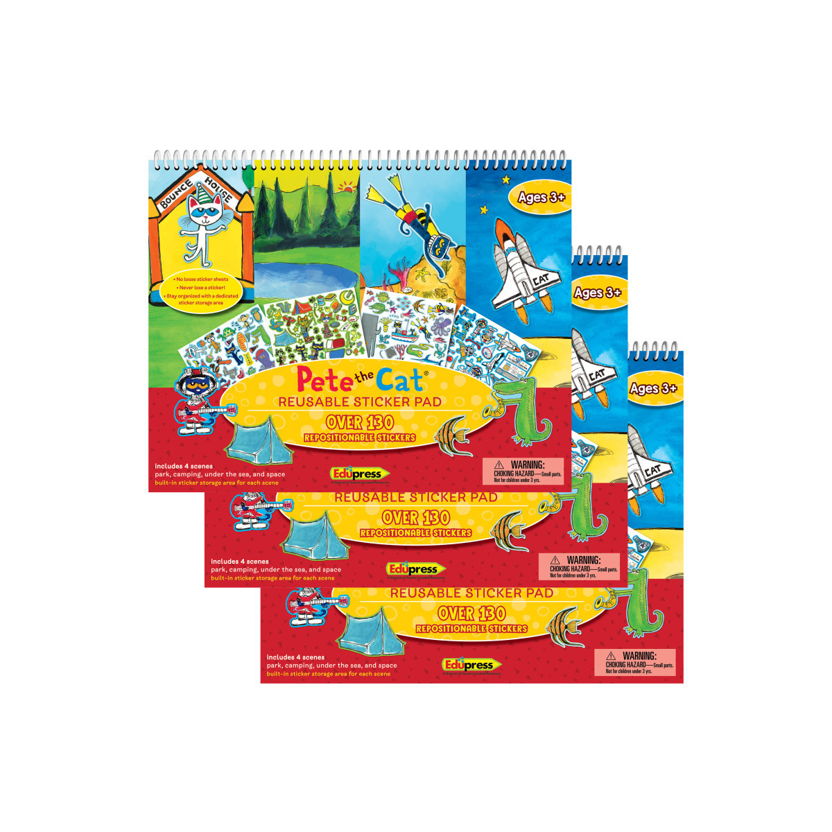 Kids will be busy and happy with these reusable sticker pads. Each spiral-bound pad comes with 4 full-color scenes for hours of imaginative play. They're perfect for car rides, plane trips, days at the beach or park, or any time your kids need some creative fun. Each pad comes with over 120 repositionable stickers that can be used again and again! Sold as a pack of 3 sticker pads.