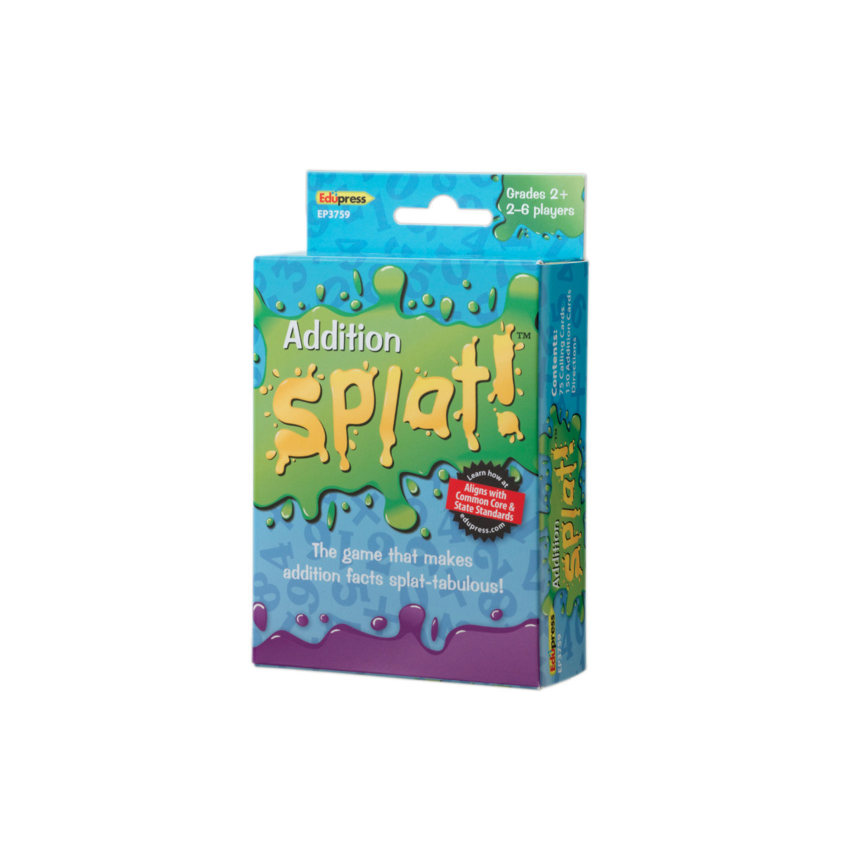 The game that makes addition facts splat-tabulous! Provides practice for addition facts from 1x1 to 12x12. As the caller reads each addition answer aloud, players scan the cards in front of them. If a player has a matching problem, he or she says SPLAT! and flips the card over. The first player to flip over all of his or her cards wins! Three color-coded decks make it easy to adapt the game for one-on-one practice or multiple players. For 2-6 players. Set of 225, 3.5" x 2.25" cards. Grade 3+.