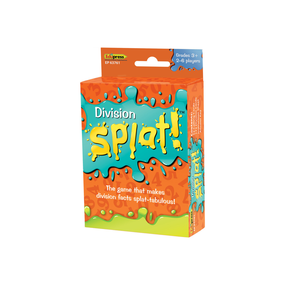 The game that makes division facts splat-tabulous! Provides practice for Division Facts from 0÷0 to 144÷12. As the caller reads each division answer aloud, players scan the cards in front of them. If a player has a matching problem, he or she says "SPLAT!" and flips the card over. The first player to flip over all of his or her cards wins! Four color-coded decks make it easy to adapt the game for one-on-one practice or multiple players. For 2-6 players. Set of 225, 3-1/2" x 2-1/4" cards. Grades 3+.