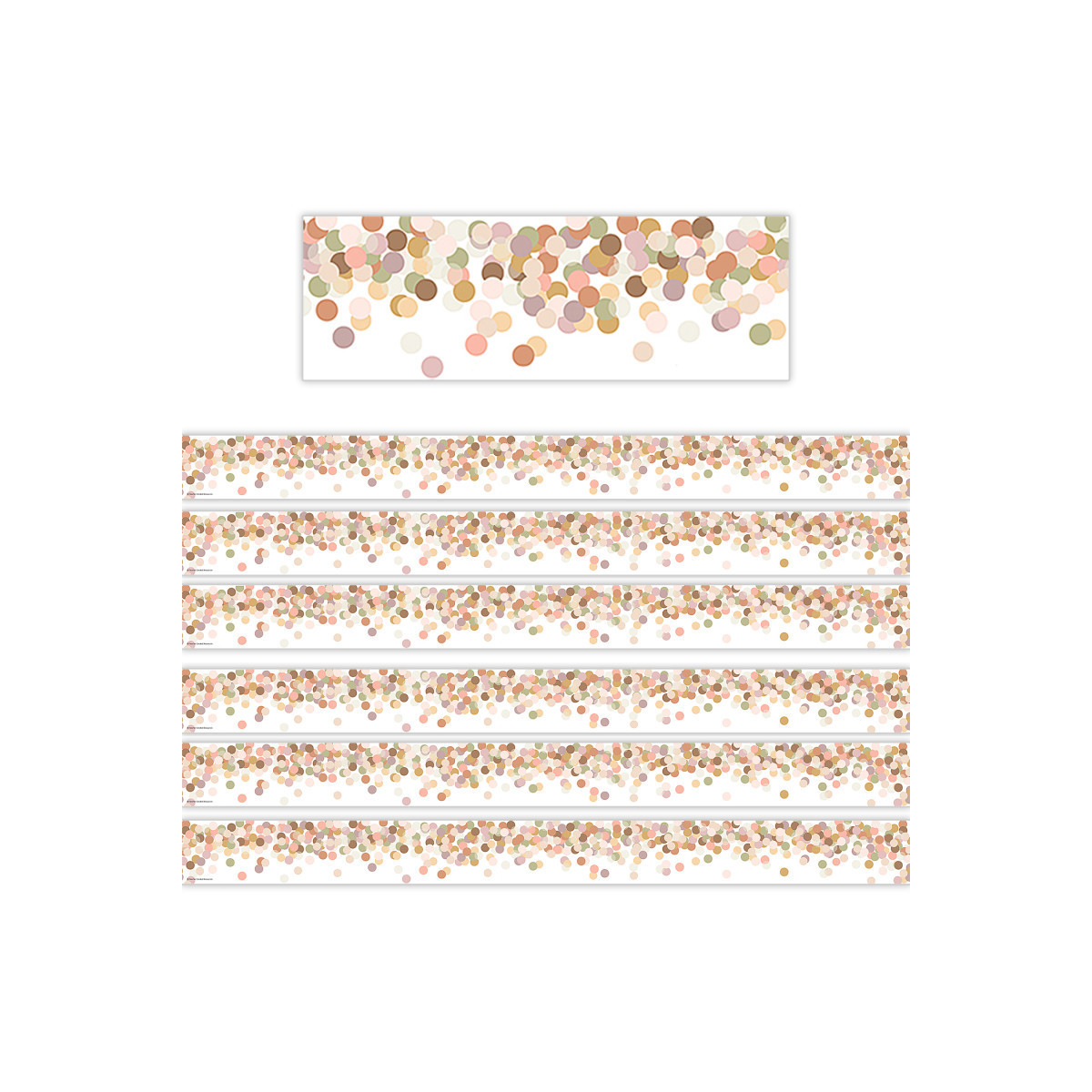 Use this calming confetti border trim to liven up your classroom! Create fresh looks for bulletin boards, windows, walls, and class projects. Mix and match with coordinating products (stickers, notepads, awards, etc.) for a classroom theme. Each pack has 12 pieces (3" x 35") for a total length of 35 feet of trim! Sold as 6 packs for a total of 72 pieces (210 feet).