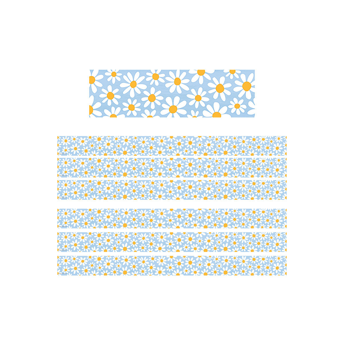 Use this daisies border trim to liven up your classroom! Create fresh looks for bulletin boards, windows, walls, and class projects. Mix and match with coordinating products (stickers, notepads, awards, etc.) for a classroom theme. Each pack has 12 pieces (3'' x 35'') for a total length of 35 feet of trim! Sold as 6 packs for a total of 72 pieces (210 feet).