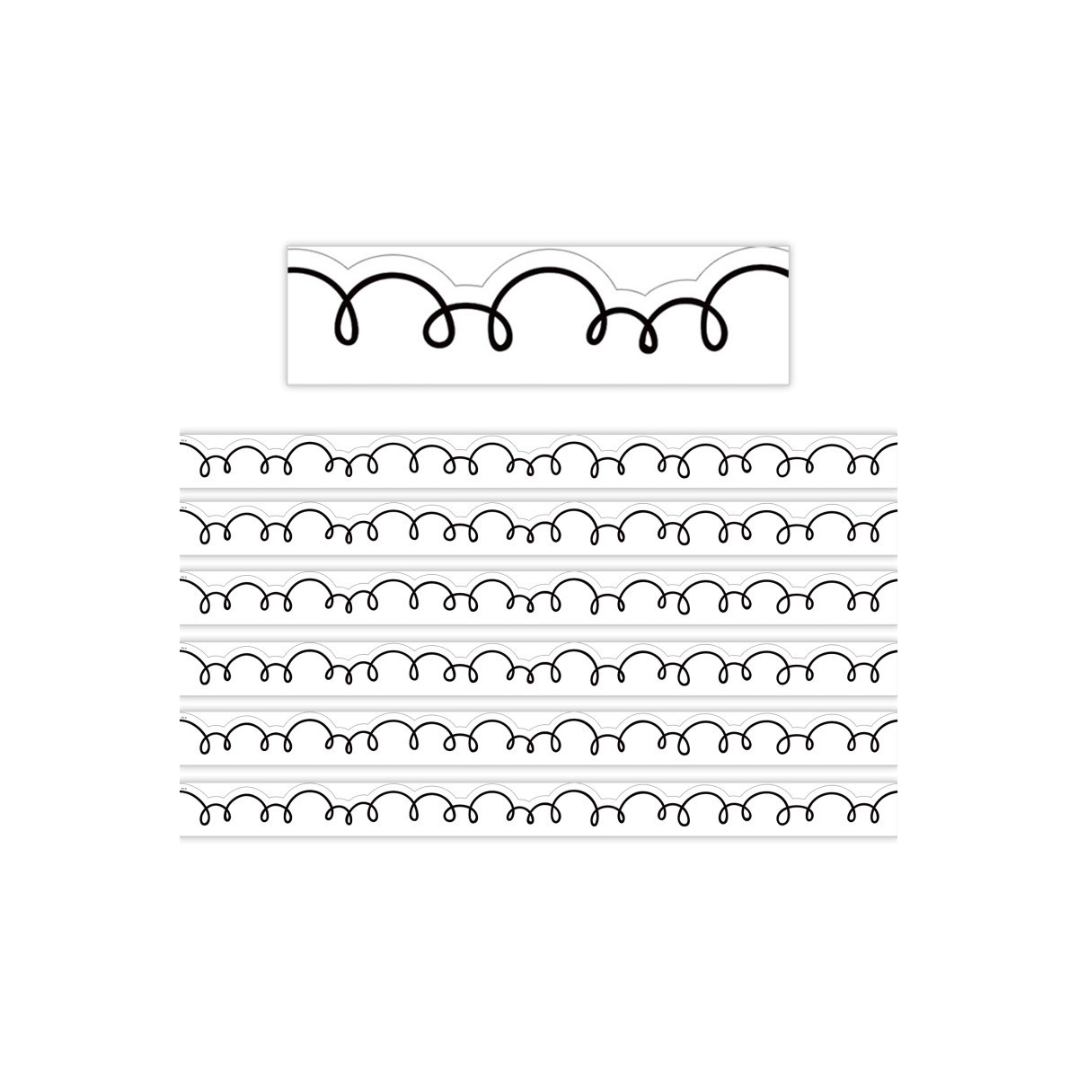 Use this white with black squiggles border trim to liven up your classroom! Create fresh looks for bulletin boards, windows, walls, and class projects. Mix and match with coordinating products (stickers, notepads, awards, etc.) for a classroom theme. Each pack has 12 pieces (3" x 35") for a total length of 35 feet of trim! Sold as 6 packs for a total of 72 pieces (210 feet).