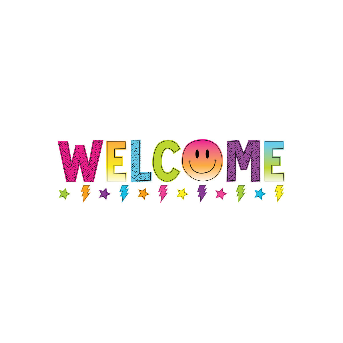 Features: 7 title pieces, spelling out "Welcome", 29 multi-purpose, blank star accents, 23 lightning bolt accents, Bulletin board guide with set-up and activity suggestions, Shiny protective coating for durability