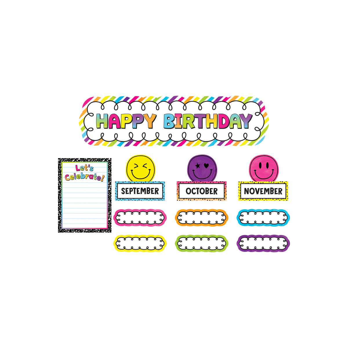 Forget their birthdays? As if! Students will love to see their names and birthdays displayed on this 1990s inspired mini bulletin board. Includes one "Happy Birthday" title piece, 12 monthly headers, one "Let's Celebrate" sign, 36 colorful labels, and a guide with suggestions and activities.