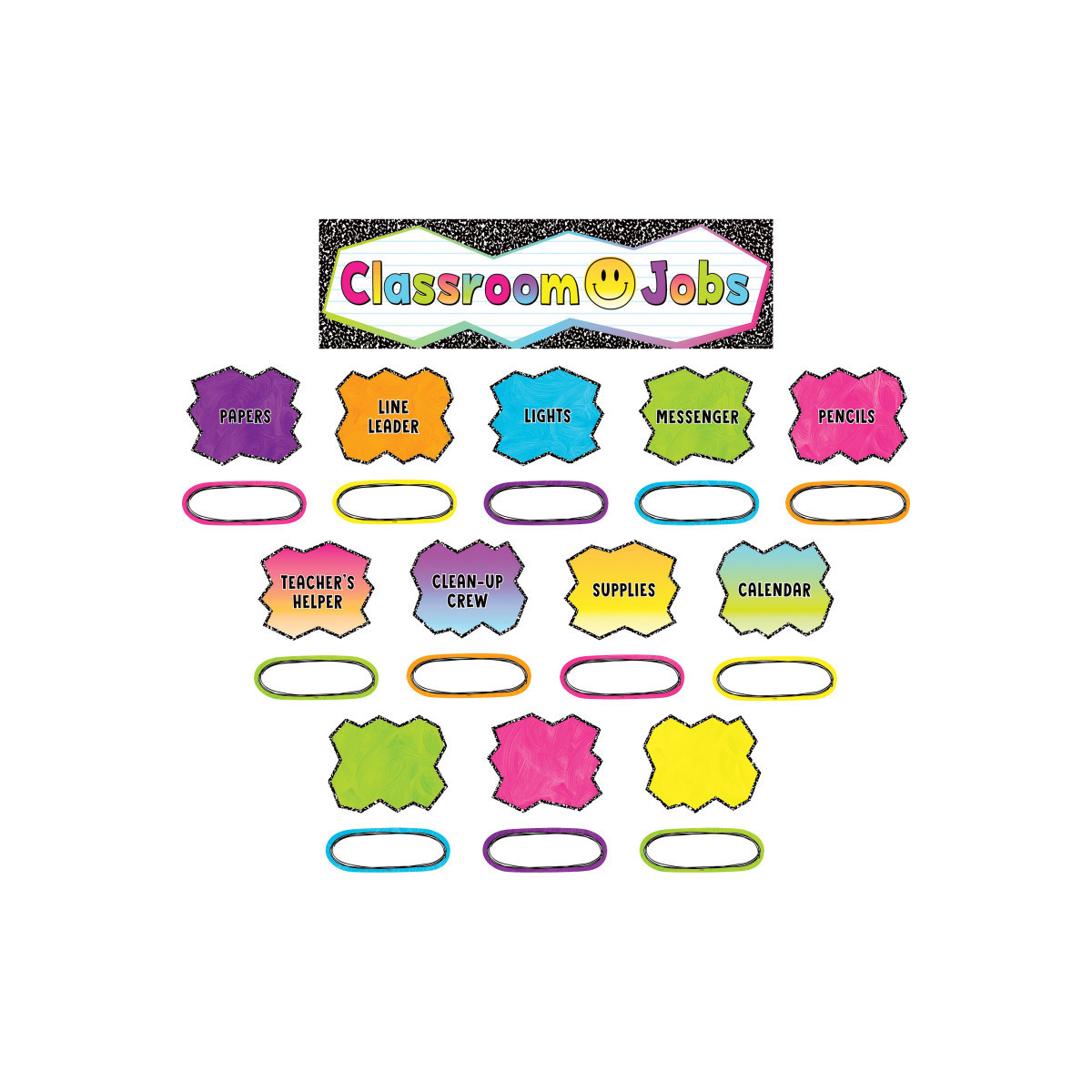 Go analogue with this retro, neon colored classroom jobs bulletin board. The set includes titles for Calendar, Clean-Up Crew, Lights, Line Leader, Messenger, Papers, Pencils, Supplies, and Teacher's Helper plus blank pieces that you can customize.