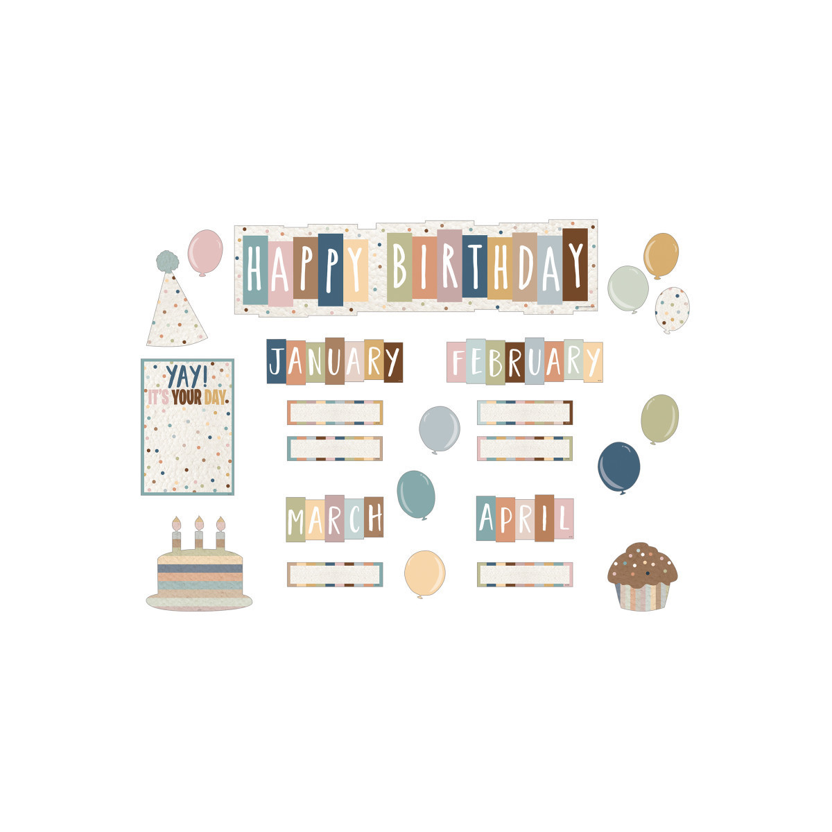 Make students feel special on their birthday with this colorful and stylish bulletin board. Happy Birthday title piece measures 20-1/2" x 5-1/2". Set includes 65 total pieces: 1 “Happy Birthday” title piece, 12 monthly headers, 1 “Yay! It’s Your Day” frame, 3 accents and 12 balloons, 36 labels, Bulletin board guide with suggestions and activities.