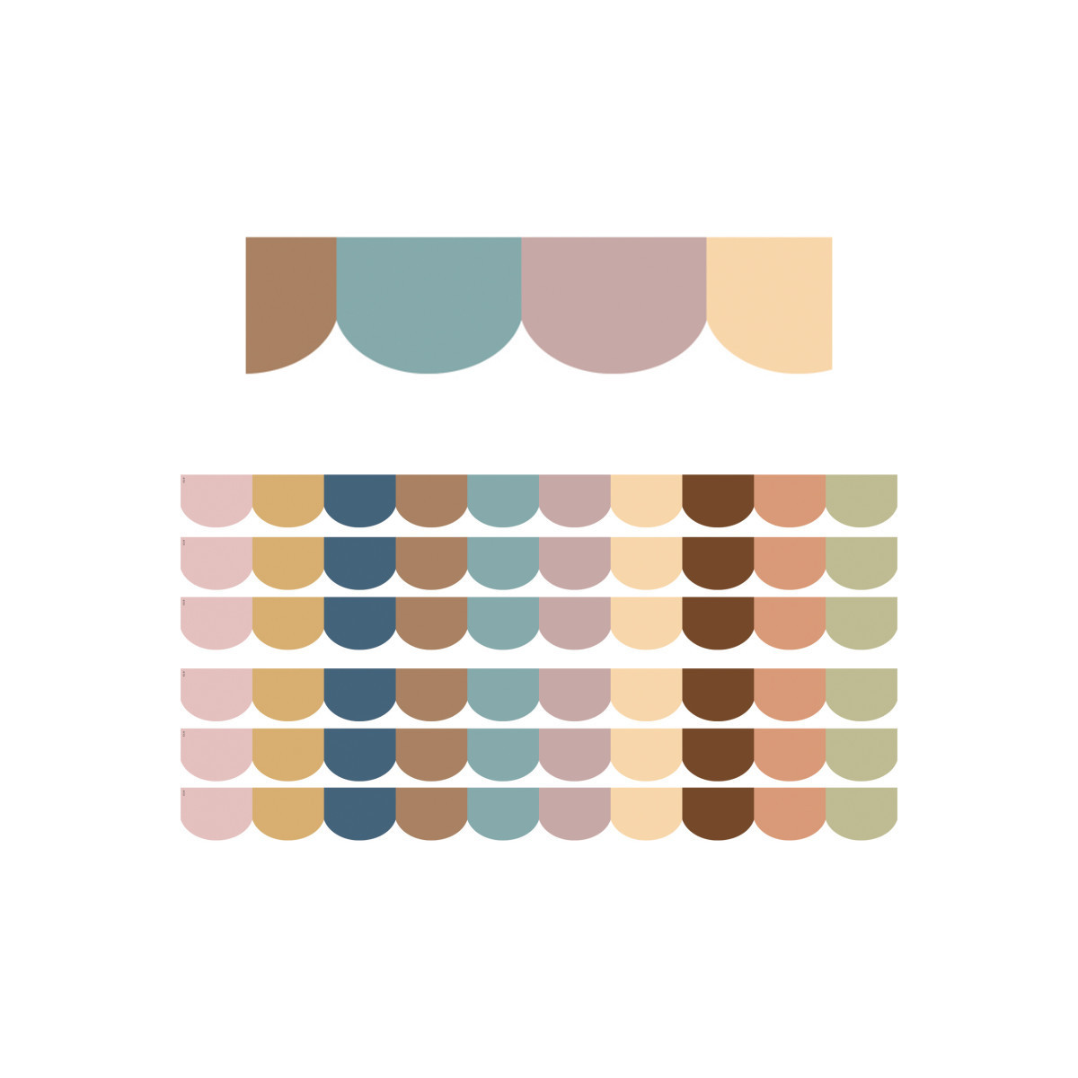 Use scalloped border trim to liven up your classroom! Create fresh looks for bulletin boards, windows, walls, and class projects. Mix and match with coordinating products (stickers, notepads, awards, etc.) for a classroom theme. Each pack includes 12 pieces (approximately 2-3/16" x 35") for a total length of 35 feet of trim! Sold as 6 packs for a total of 72 strips (210 feet) total.