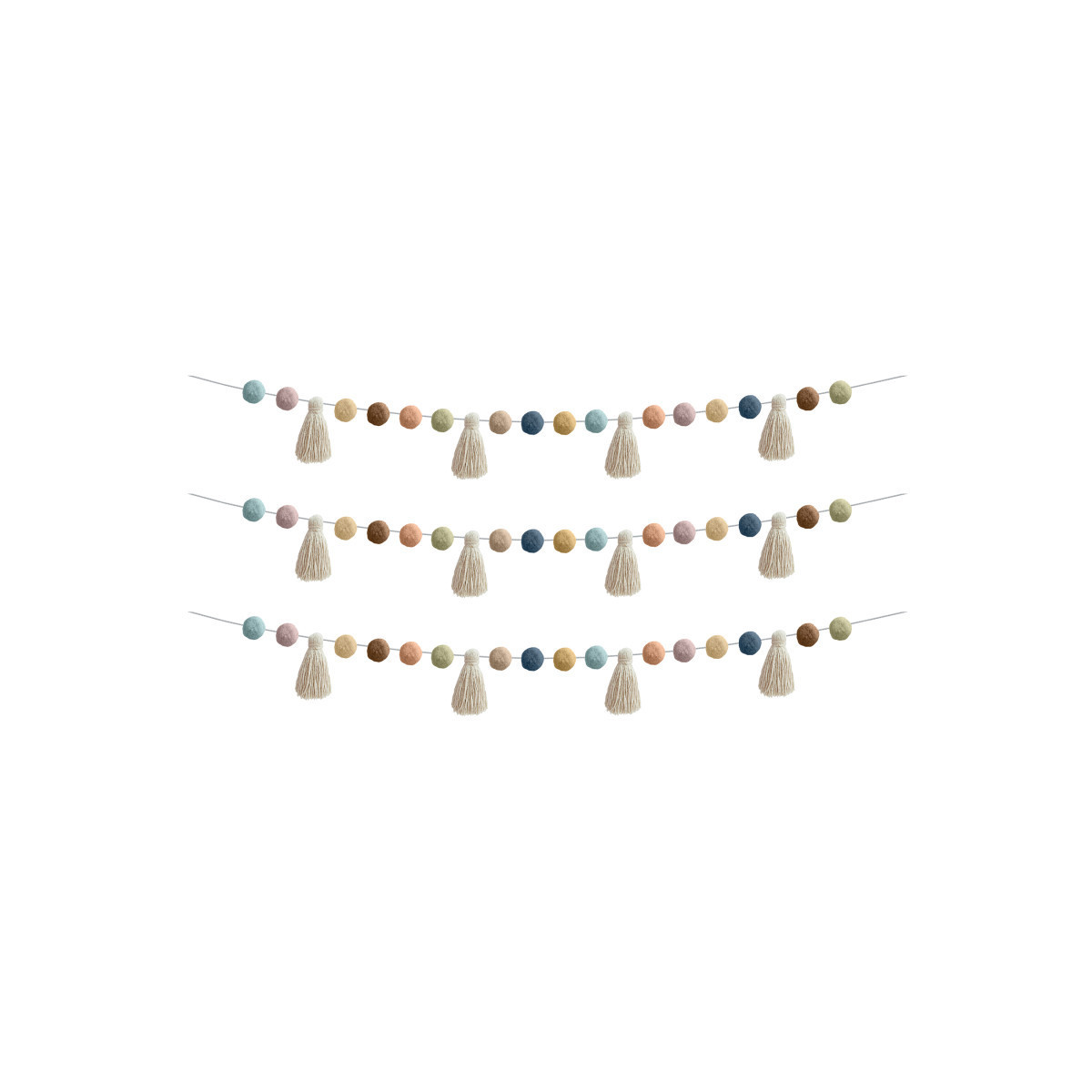 Instantly brighten any space with this pom-poms and tassels garland. This fun and festive garland will add the perfect splash of color to your home or classroom, or use it to celebrate any special occasion. Pom-poms are approximately 1-1/2" in diameter. Tassels are approximately 5" in length. Measures 60 inches in length. Sold as a pack of 3 garland strands.