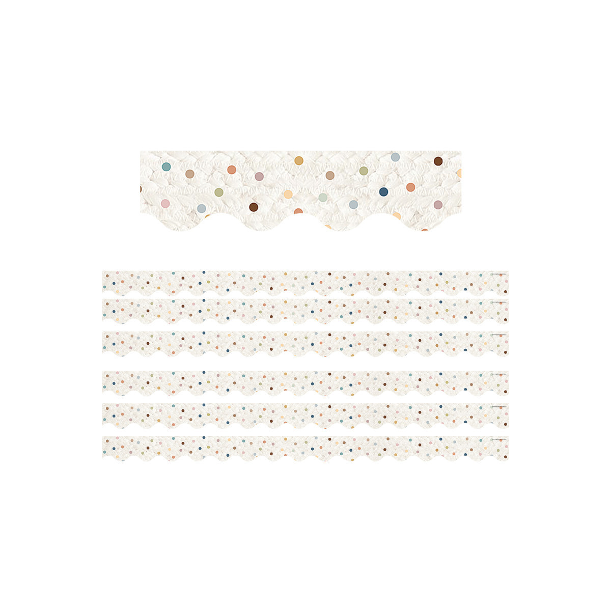 Use scalloped border trim to liven up your classroom! Create fresh looks for bulletin boards, windows, walls, and class projects. Mix and match with coordinating products (stickers, notepads, awards, etc.) for a classroom theme. Each pack includes 12 pieces (approximately 2-3/16" x 35") for a total length of 35 feet of trim! Sold as 6 packs for a total of 72 strips (210 feet) total.
