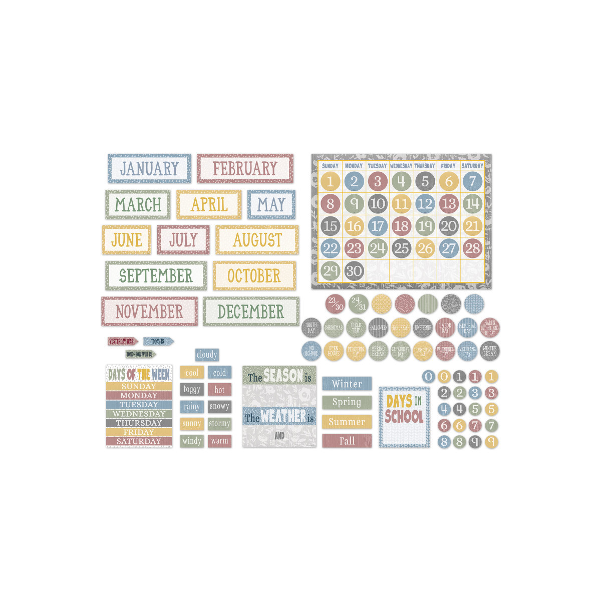 This delightful calendar display comes with easy-to-read number pieces, colorful monthly headers, and additional pieces for holidays and special occasions. It also includes pieces for counting days of the school year, the weather, seasons, days of the week as well as for yesterday, today, and tomorrow. Blank calendar measures 24" x 18". 109 total pieces.