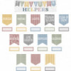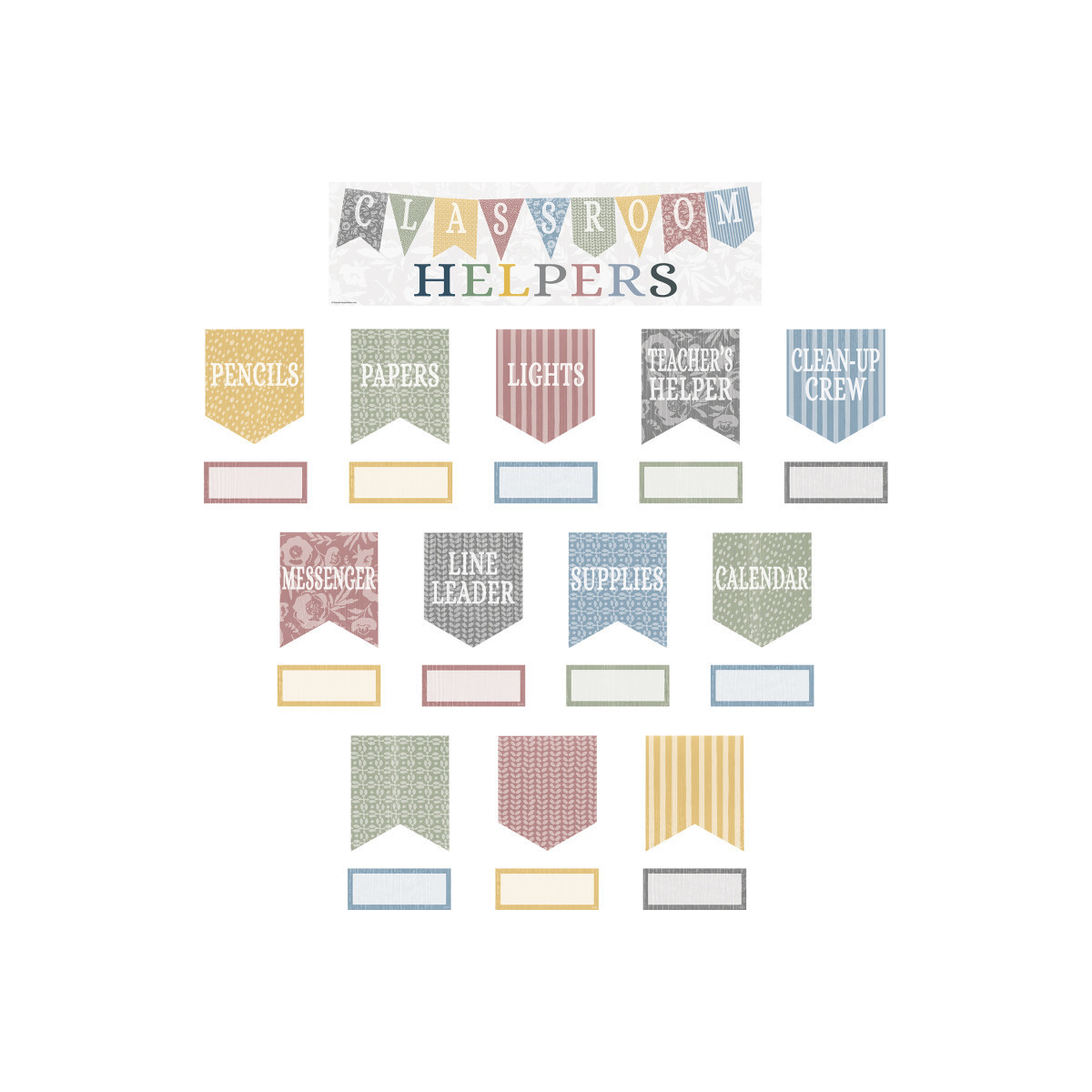 Ignite a sense of responsibility and teamwork with this adorable classroom helpers bulletin board set. The set includes titles for Calendar, Clean-Up Crew, Lights, Line Leader, Messenger, Papers, Pencils, Supplies, and Teacher’s Helper plus blank pieces that you can customize. The header piece measures 21" x 6". 48 total pieces.