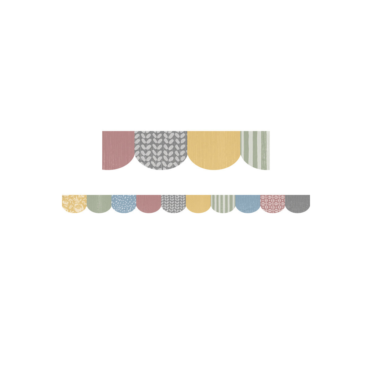 Use this classroom cottage scalloped border trim to liven up your classroom! Create fresh looks for bulletin boards, windows, walls, and class projects. Mix and match with coordinating products (stickers, notepads, awards, etc.) for a classroom theme. Each pack has 12 pieces (3" x 35") for a total length of 35 feet of trim!