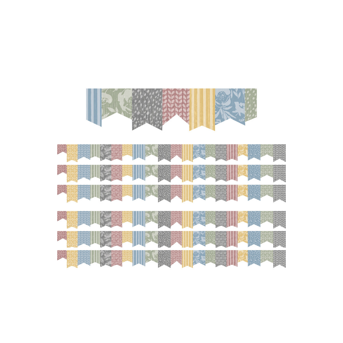Use this classroom cottage pennants border trim to liven up your classroom! Create fresh looks for bulletin boards, windows, walls, and class projects. Mix and match with coordinating products (stickers, notepads, awards, etc.) for a classroom theme. Each pack has 12 pieces (3" x 35") for a total length of 35 feet of trim! Sold as 6 packs for a total of 72 pieces (210 feet).