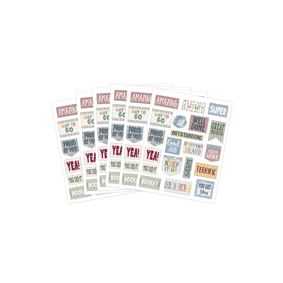 Celebrate a job well done with encouraging stickers in a cozy palette of warm tones and fun designs! Each sticker is acid-free & lignin-free and measures about 2-1/2" x 1/2". Each pack includes 120 stickers in 10 designs.