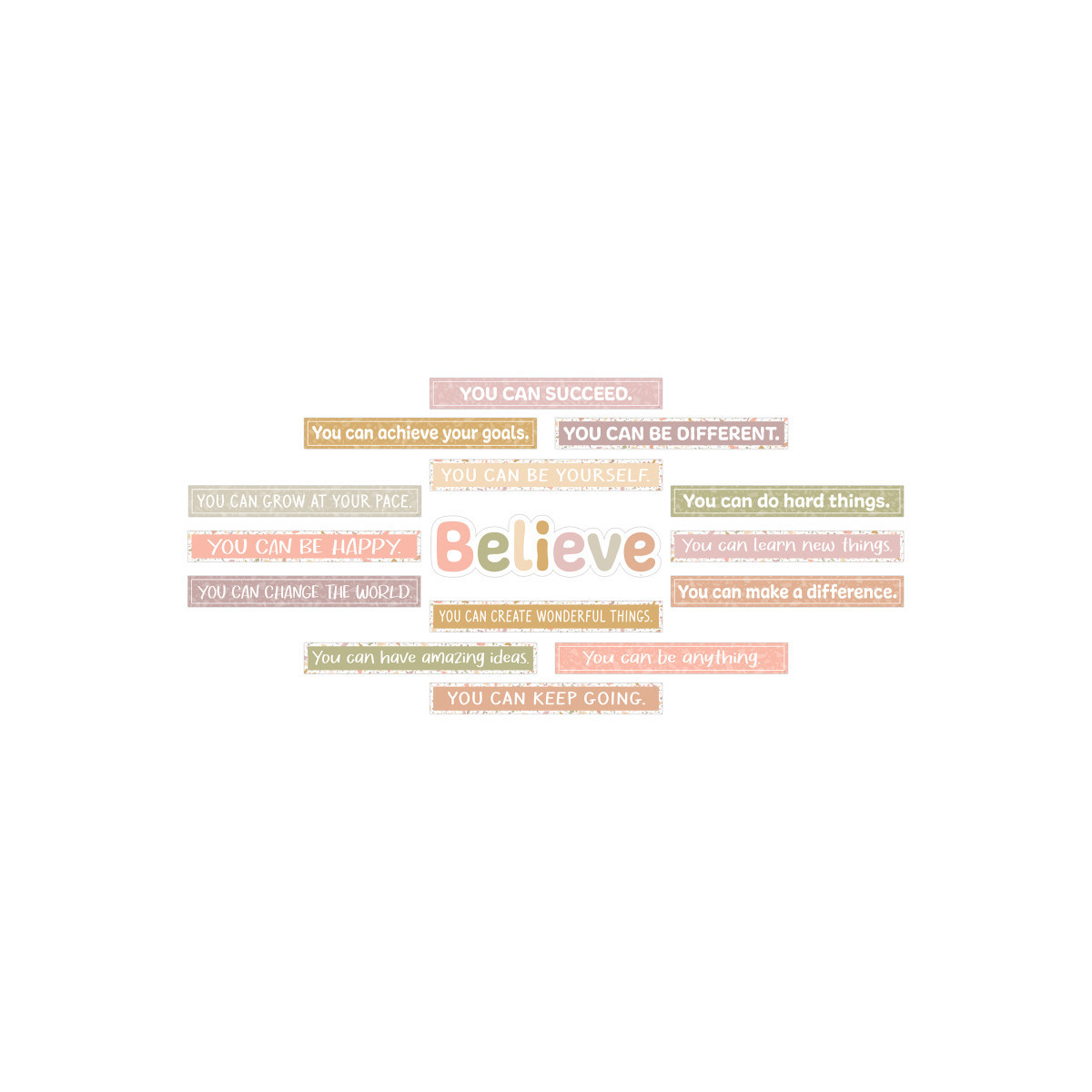 Infuse your learning environment with messages that can fortify positive self-talk with messages in a warm and soothing palette. BELIEVE piece is 20-1/2" x 5-1/2" and each "You can" piece is 20-3/4" x 2-3/4". 15 total pieces. Shiny, protective coating. Features: 1 "Believe" title piece, 14 positive sayings, Bulletin Board Guide with suggestions and activities.