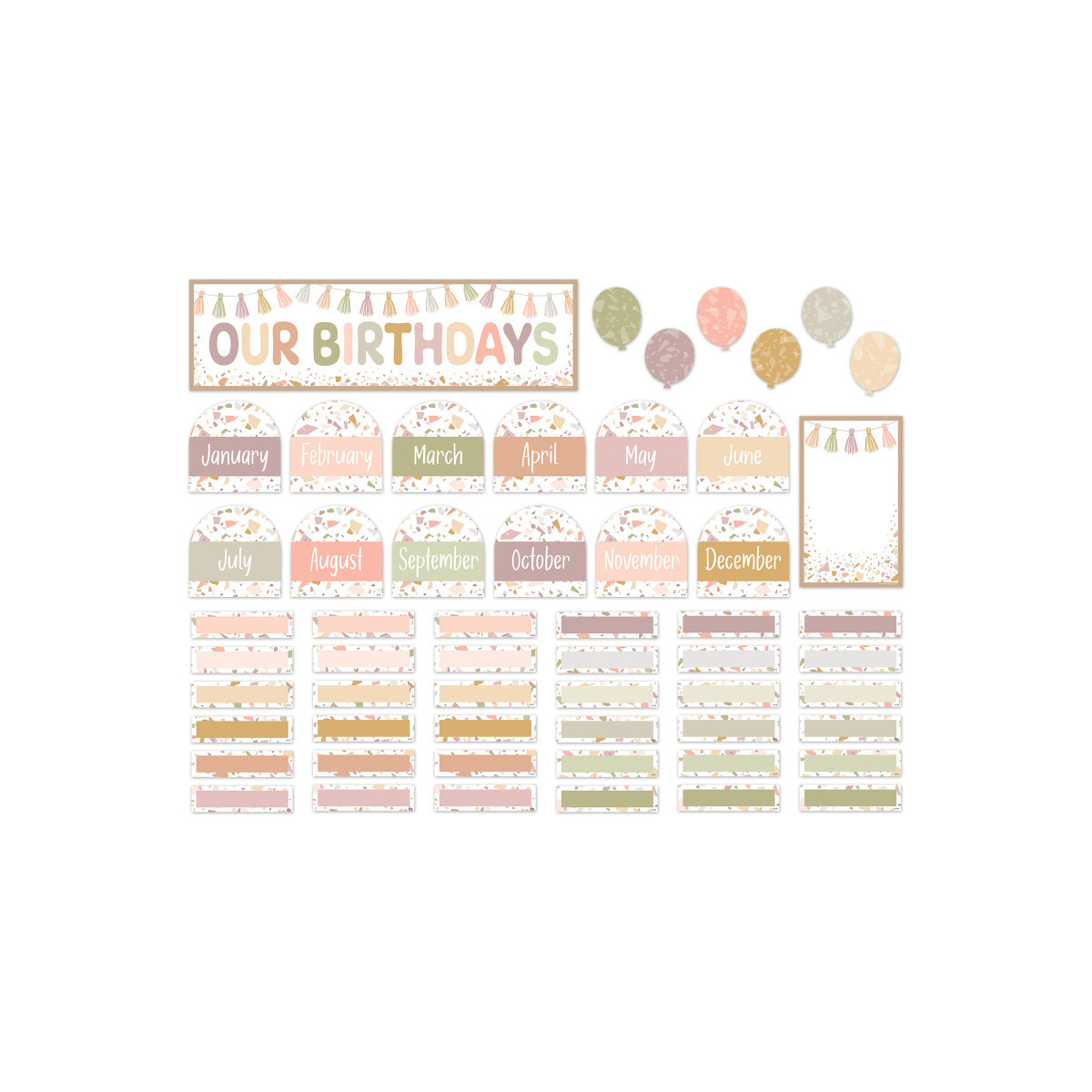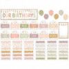 Shine a spotlight on students with this charming and celebratory birthday mini bulletin board. Header piece measures 21" x 6". 56 total pieces. Shiny, protective coating. Features: 1 "Our Birthdays" title piece, 12 monthly headers, 1 decorative frame, 6 balloon accents, 36 labels, Bulletin board guide with suggestions and activities.