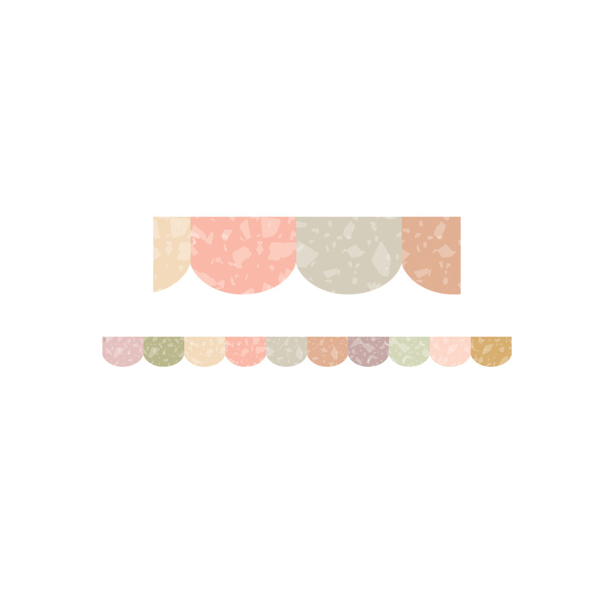 Use this terrazzo tones scalloped border trim to liven up your classroom! Create fresh looks for bulletin boards, windows, walls, and class projects. Mix and match with coordinating products (stickers, notepads, awards, etc.) for a classroom theme. Each pack has 12 pieces (3" x 35") for a total length of 35 feet of trim!