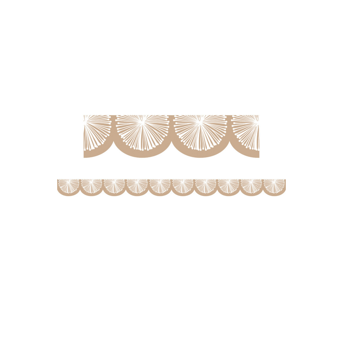 Use this natural poms scalloped border trim to liven up your classroom! Create fresh looks for bulletin boards, windows, walls, and class projects. Mix and match with coordinating products (stickers, notepads, awards, etc.) for a classroom theme. Each pack has 12 pieces (3" x 35") for a total length of 35 feet of trim!