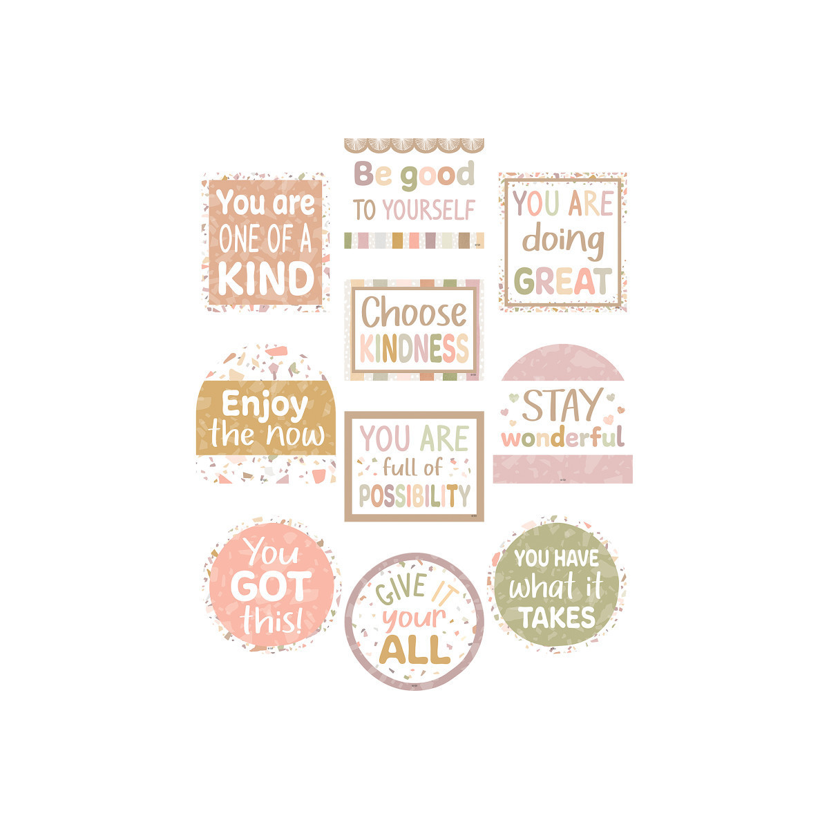 Use these decorative Moving Mountains Positive Sayings Accents to dress up classroom walls and doors, label bins and desks, or accent bulletin boards. Each pack includes 30 pieces in 10 designs.