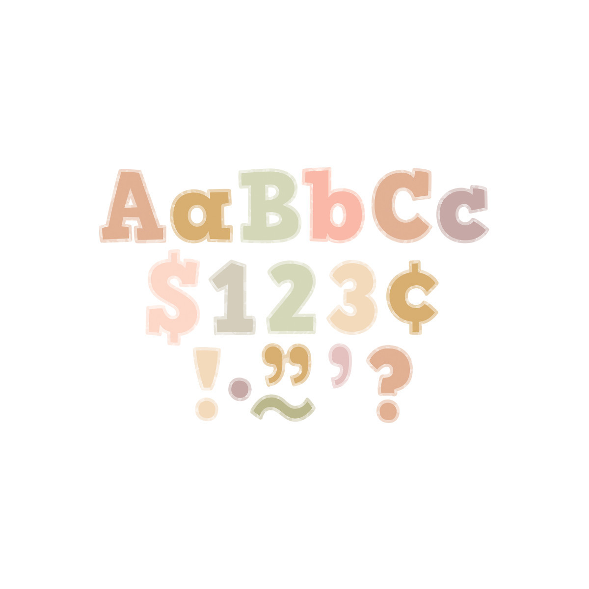 Use these letters to create bulletin boards, classroom centers, signs, banners, and other displays. They punch out easily and are coated for durability. The colors and designs coordinate with popular decorative products from Teacher Created Resources. Measures 4". Each pack includes 230 total pieces: 61 uppercase letters, 95 lowercase letters, 20 numbers 0 to 9, 40 punctuation marks, and 14 Spanish accent marks.