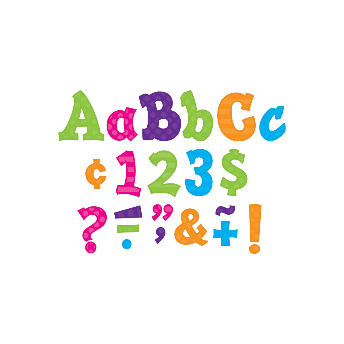 Add "Sass" to your displays with these colorful letters! Includes 191 letters, 20 numerals, and punctuation pieces. 238 total pieces per package. Colors include: blue, green, orange, pink, and purple.