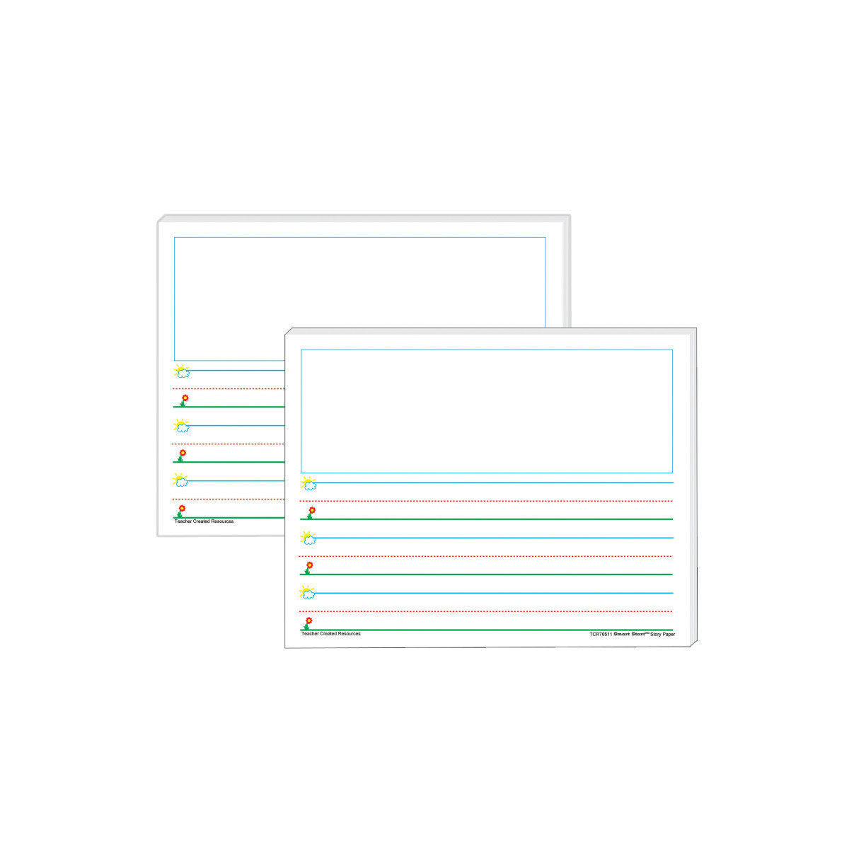Smart Start Story Paper (11"x 8-1/2") is truly a "Smart Start" for beginning and experienced writers. Bold graphics in blue, green, and red promote the feeling of success as children simply "Start at the Sky and pull down to the Ground" to form letters correctly. K-1 Story Paper has space for a picture, and the lines have 1" spacing. Each pack includes 100 sheets. Sold as 2 packs for a total of 200 sheets.