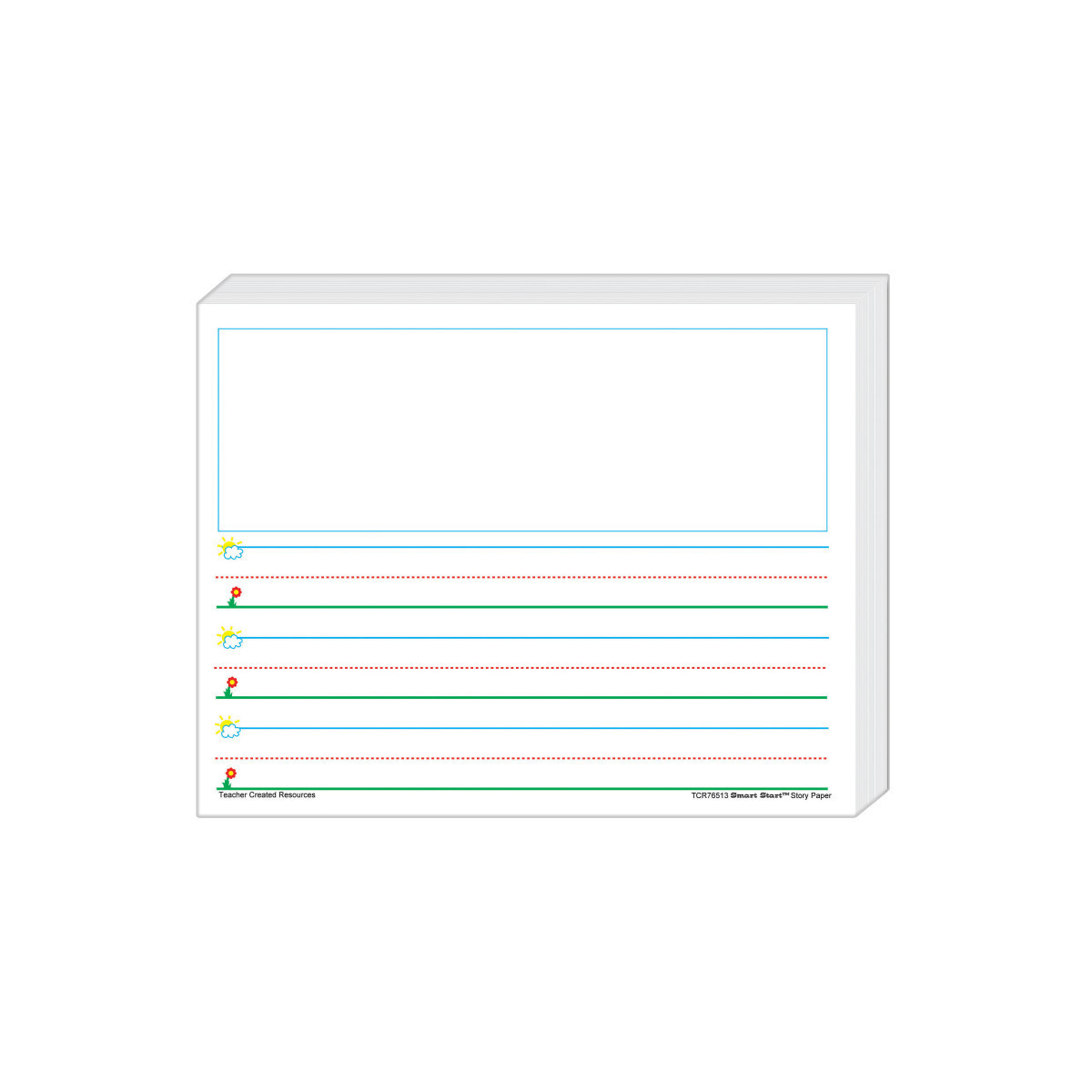Smart Start Story Paper (11" x 8.5") is truly a "Smart Start" for beginning and experienced writers. Bold graphics in blue, green, and red promote the feeling of success as children simply "Start at the Sky and pull down to the Ground" to form letters correctly. K-1 Story Paper has space for a picture, and the lines have 1" spacing. Package includes 360 sheets.