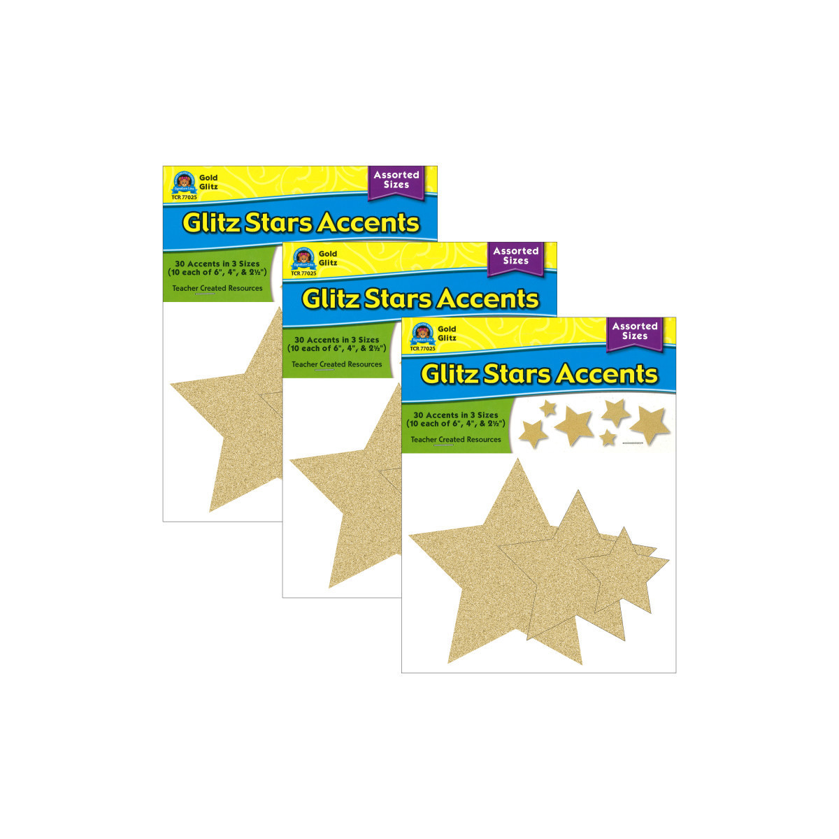 Use the Gold Glitz Stars Assorted Sizes Accents to dress up classroom walls and doors, label bins and desks, or accent bulletin boards. Each pack includes 30 stars in 3 sizes: (10) 6", (10) 4-1/2", (10) 2-5/8". Sold as 3 packs for a total of 90 stars.