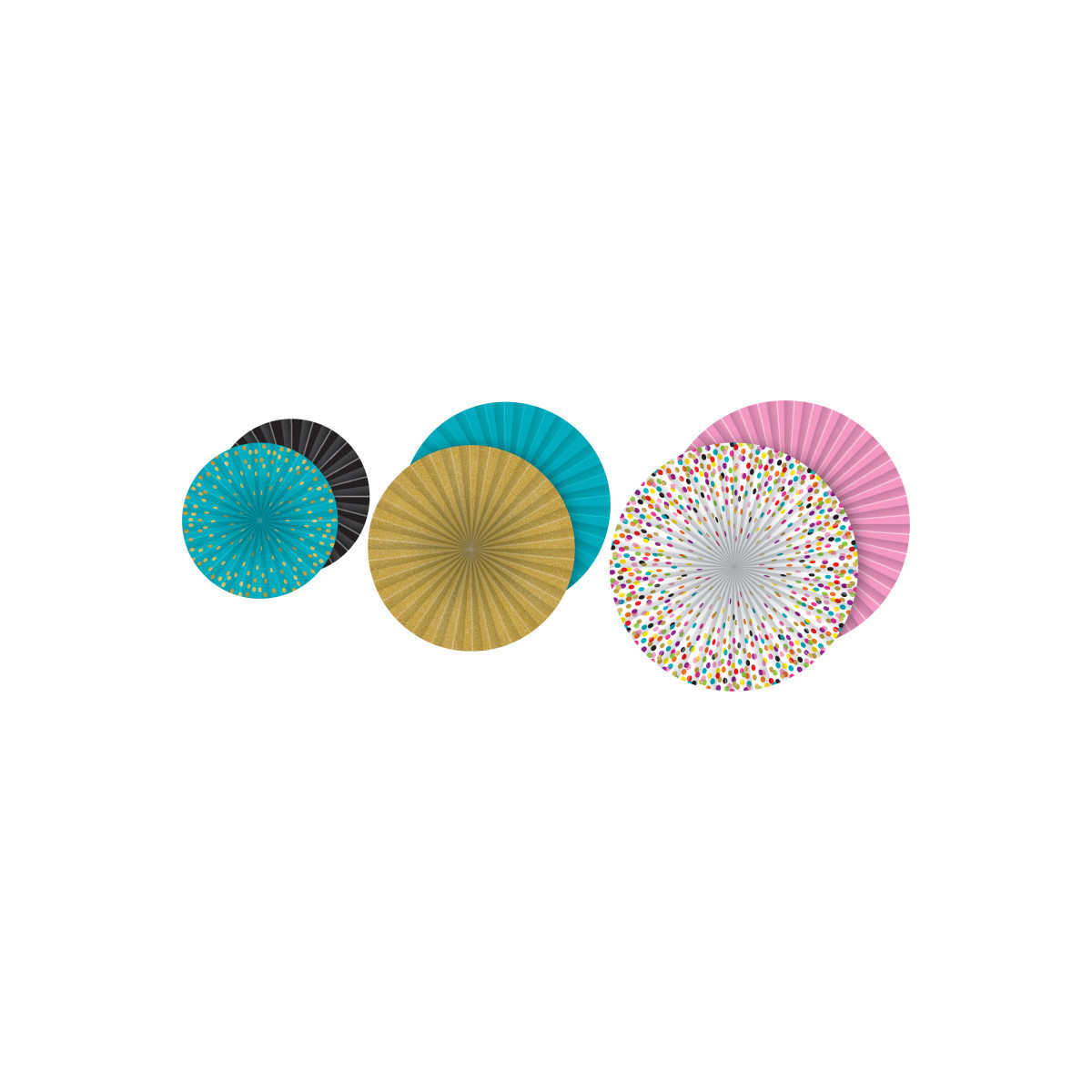 Create the perfect look for your classroom with these Hanging Paper Fans! Coordinate with similar patterns and colors to make a chic environment. Use them to fill empty corners, accent work areas and learning centers, or design fabulous displays around your bulletin boards. Includes 3 double-sided fans with a self-adhesive strip and string for hanging. Each fan is double sided: 12" fan: Teal Confetti/Black, 16" fan: Gold Shimmer/Teal, 19" fan: Confetti/Pink