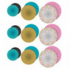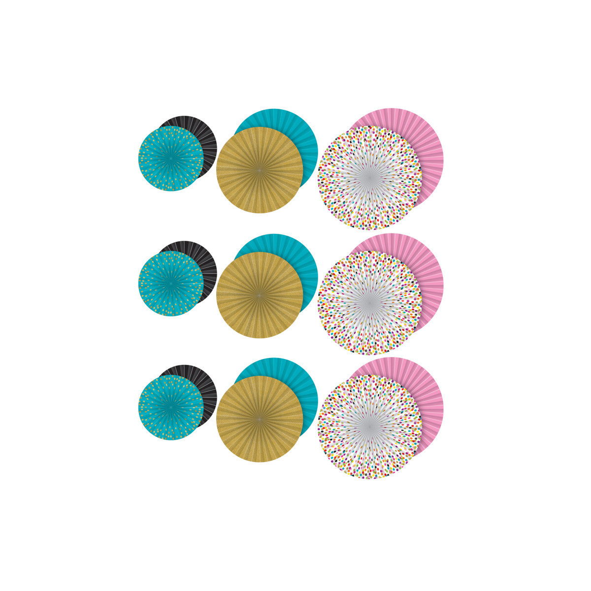 Create the perfect look for your classroom with these Hanging Paper Fans! Coordinate with similar patterns and colors to make a chic environment. Use them to fill empty corners, accent work areas and learning centers, or design fabulous displays around your bulletin boards. Includes 3 double-sided fans with a self-adhesive strip and string for hanging. Sold as 3 packs for a total of 9 fans. Each fan is double sided: 12" fan: Teal Confetti/Black, 16" fan: Gold Shimmer/Teal, 19" fan: Confetti/Pink.