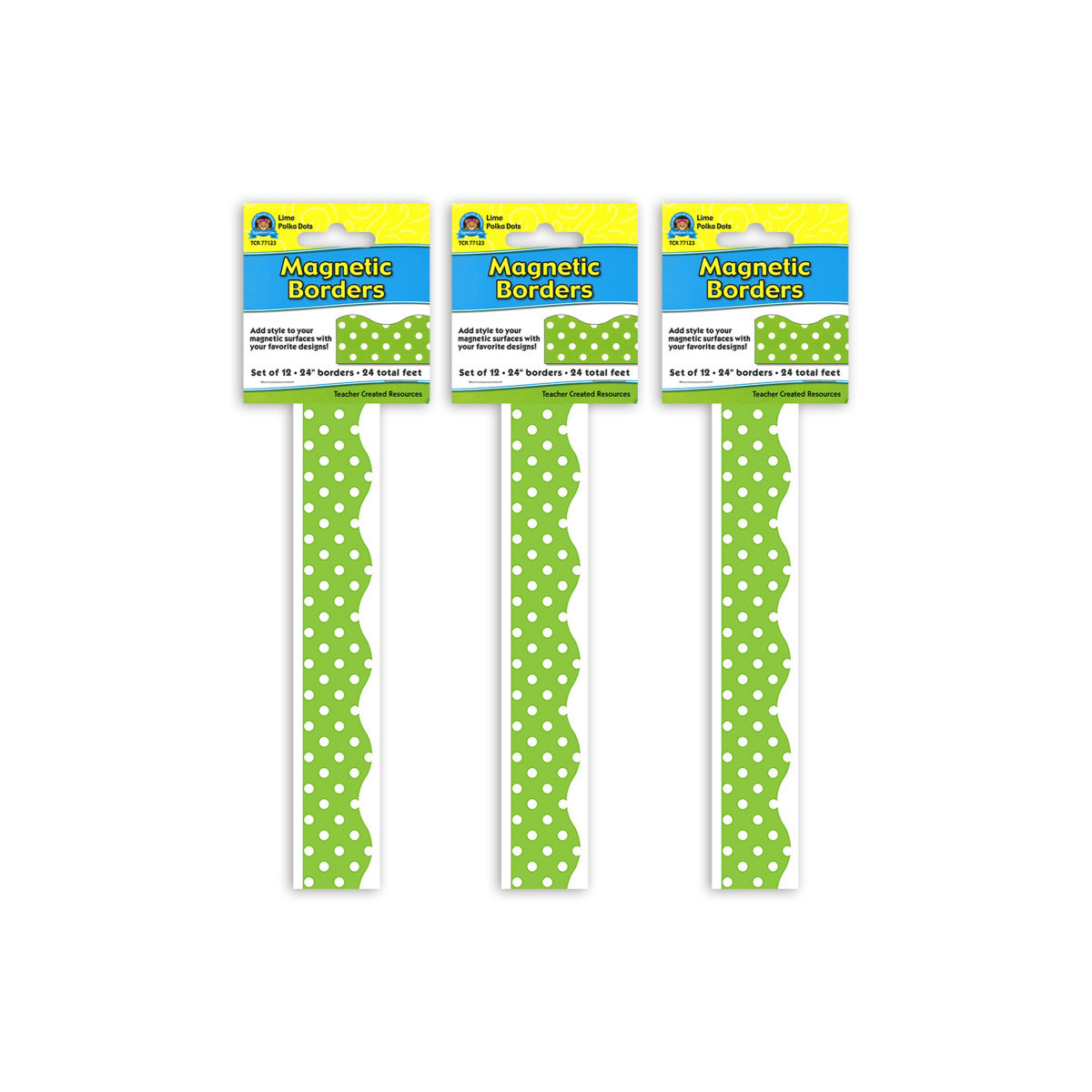 Decorate your whiteboard in a snap with durable, reusable magnetic decor! Adds flair on other metal surface such as doors, desks, shelving, and bins. Cuts easily with scissors to make your own labels or game pieces. Each magnetic border is 24" x 1½". Each pack contains 12 strips for 24 feet. Sold as 3 packs for a total of 36 strips (72 feet).