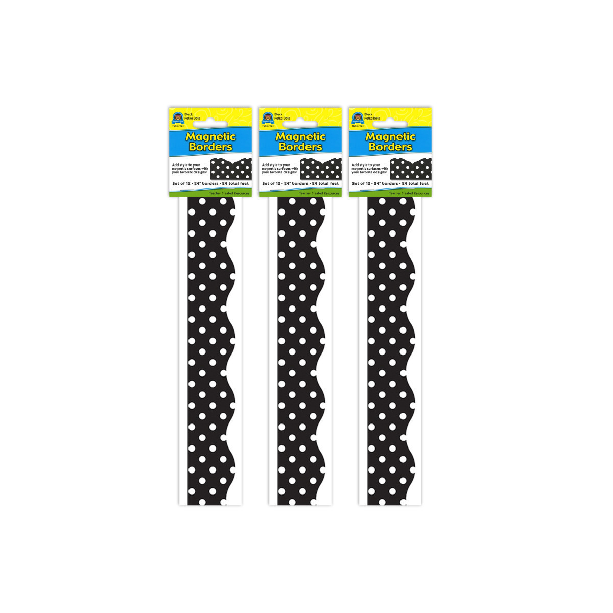 Decorate your whiteboard in a snap with durable, reusable magnetic decor! Adds flair on other metal surface such as doors, desks, shelving, and bins. Cuts easily with scissors to make your own labels or game pieces. Each magnetic border is 24" x 1½". Each pack contains 12 strips for 24 feet. Sold as 3 packs for a total of 36 strips (72 feet).