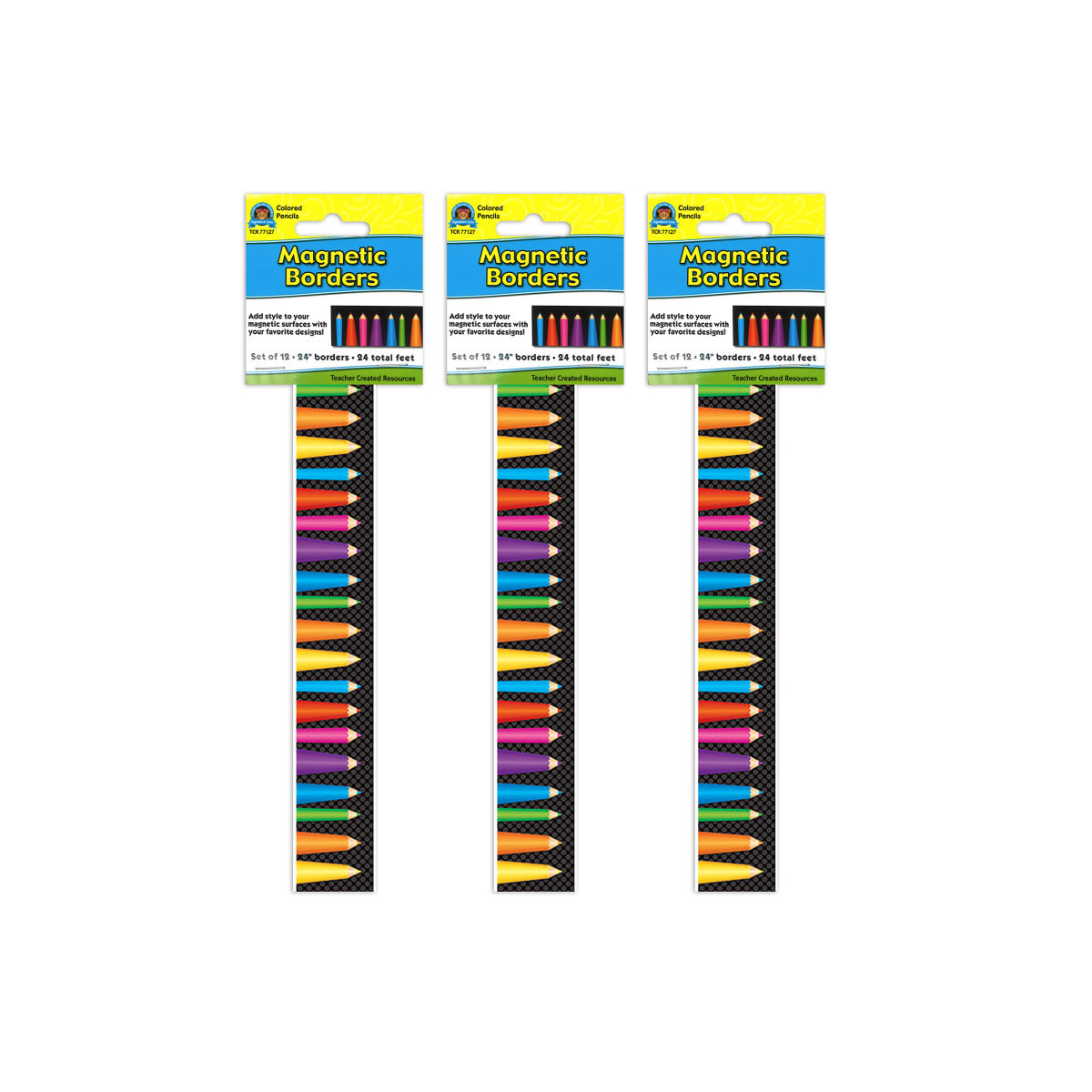 Decorate your whiteboard in a snap with durable magnetic decor! Add flair to other metal surface such as doors, desks, shelving, and bins. Cuts easily with scissors to make your own labels or games pieces. Includes 12 pieces per pack. Each magnetic border is 24" x 1-1/2". Each pack includes 12 pieces for a total of 24 feet. Sold as 3 packs for a total of 36 pieces (72 feet).