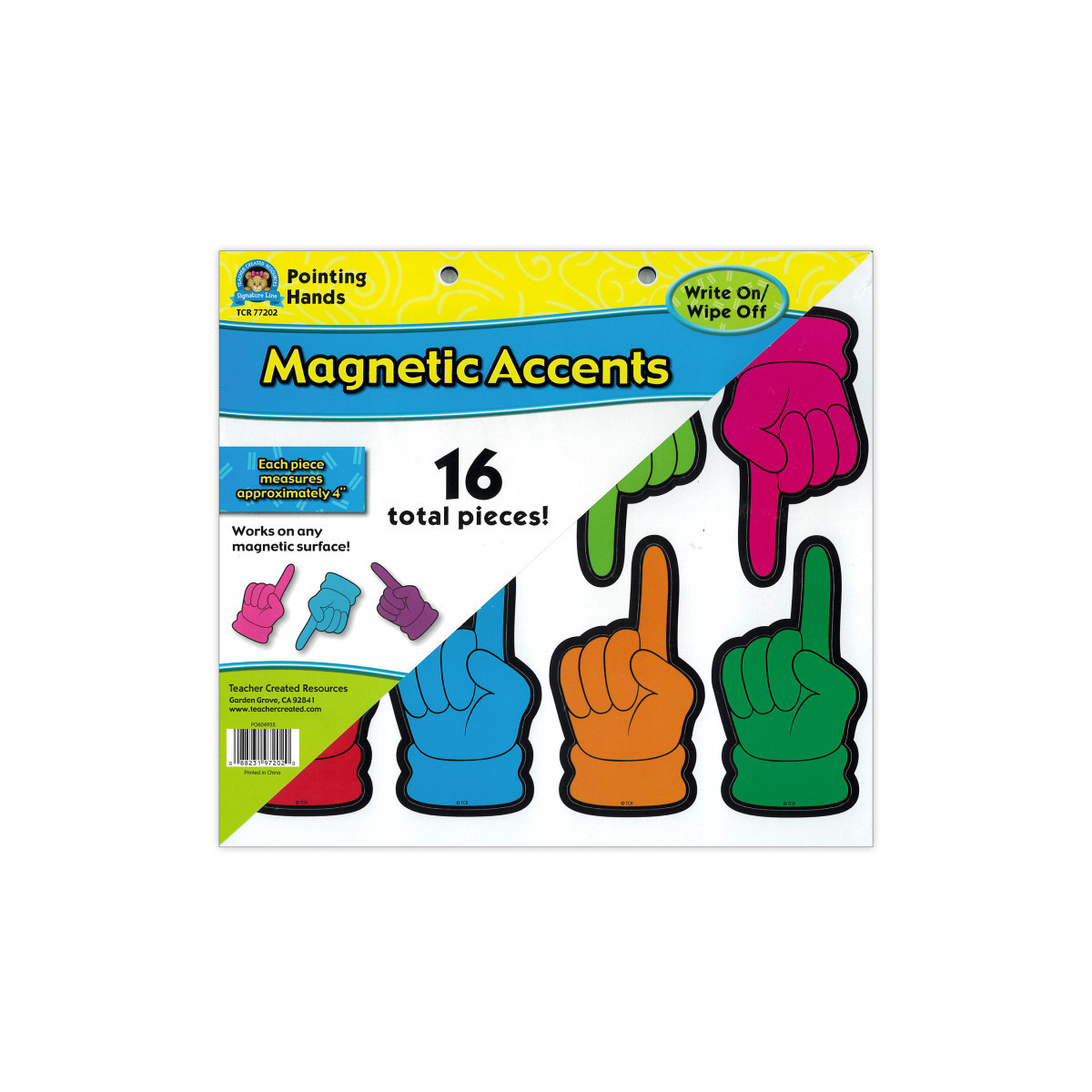 Decorate your whiteboard in a snap with durable, reusable magnetic decor! Add flair to any magnetic receptive surface such as doors, desks, shelving, and bins. Measures about 4". Each pack includes 16 accents in 8 colors.