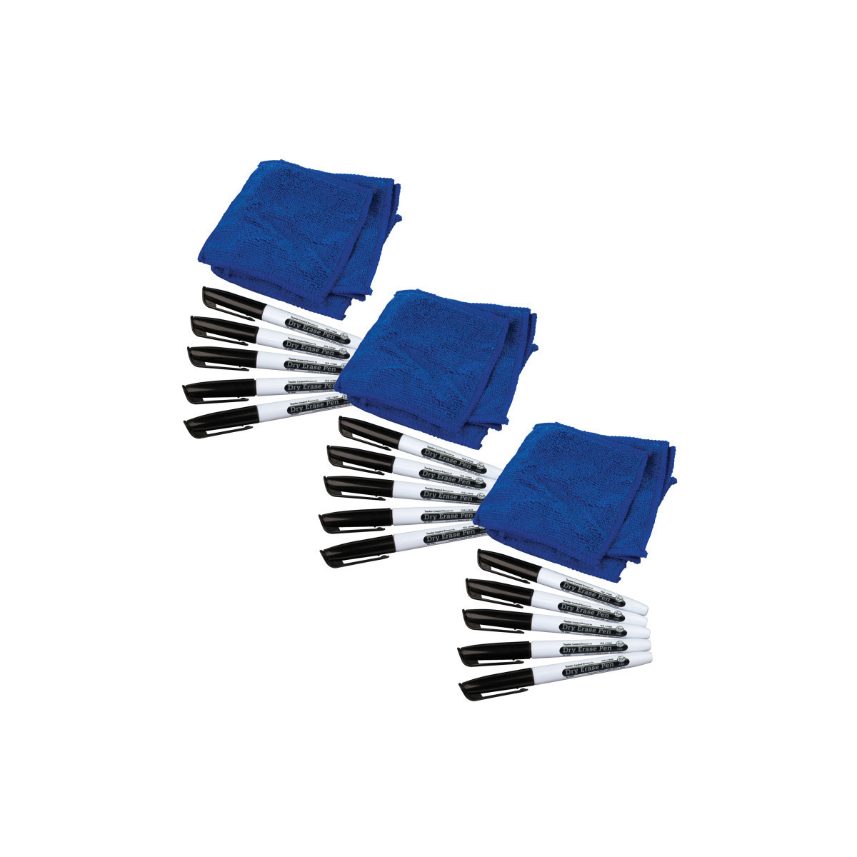 Write on any dry erase surface and wipe off easily with microfiber towels—cleans better than standard whiteboard erasers. Each set includes 5 dry erase pens and 5 soft towels. Towels measure 4-1/2" x 4-1/2". Sold as 3 sets for a total of 15 pens and 15 towels.