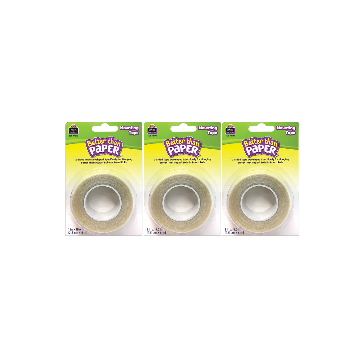Securely hang your bulletin board rolls with this high-tack double-sided adhesive. This mounting tape is specifically designed to hang Better Than Paper® from virtually any surface! Use it on painted brick, painted walls, fabric bulletin boards, cloth cubical walls, whiteboards, wood trim, plastic surfaces, metal doors, and much more! Also works with butcher paper, and other types of bulletin board paper. PLEASE NOTE: Better than Paper® Mounting Tape is strong and could potentially cause damage when removed from certain surfaces. To protect these surfaces, we recommend using a piece of Mavalus® tape or tape specifically designed not to damage walls as a buffer between the Better than Paper® Mounting Tape and the surface to be protected. Sold as 3 rolls.