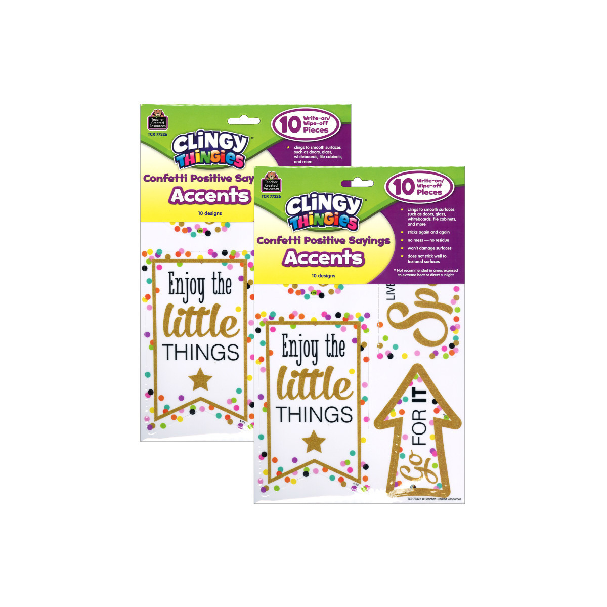 Use these Clingy Thingies® decorations to inspire and motivate kids of all ages, dress up classroom walls and doors, and accent bulletin boards. Clingy Thingies® are made with a special cling technology. They are not sticky to the touch, yet they stick to any smooth surface and can be easily removed. You can even use water to rinse lint or dirt off the back surface. Clingy Thingies® can be used again and again without leaving any mess or residue. They also feature a write-on/wipe-off surface, perfect for notes, labeling, and reminders. Largest piece Approximately 10⅜" x 2½". 10 pieces per pack. Sold as 2 packs for a total of 20 pieces.