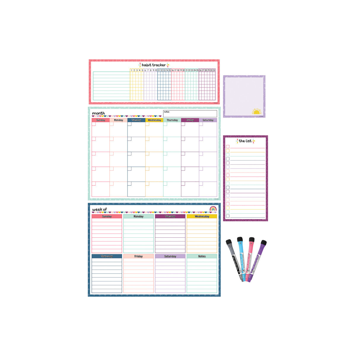 Keep track of important dates, activities, and tasks with this write-on/wipe-off dry-erase magnetic calendar set. Organize your busy schedule by filling in the monthly and weekly calendar charts. Use the habit tracker to stay on top of daily routines like exercising and practicing a skill. For notes and reminders, use the list or the square note to keep track of what you need or quickly get your point across. Use on refrigerators, whiteboards, lockers, metal desks, metal shelves and more. Includes 4 dry-erase pens in black, blue, pink, and purple. This set includes 17" x 12" monthly calendar, 17" x 12" weekly calendar, 16.75" x 5.75" habit tracker, 5.75" x 11" list, and 5.425" x 5.425" square note.